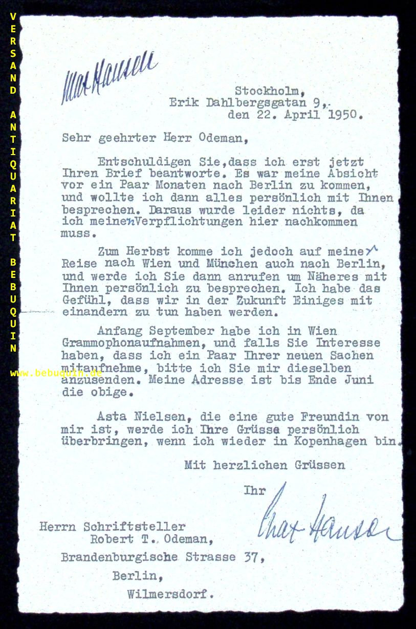 HANSEN, Max: Maschinenschriftl. zweifach eigenhändig signierter Brief an den bekennenden homosexuellen Schriftsteller Robert T. Odeman. Stockholm, 1950. 1 S. in den Falzen leicht eingerissen. Interessanter früher Nachkriegskontakt der beiden berühmten Kabarettisten. „Asta Nielsen, die eine gute Freundin von mir ist, werde ich Ihre Grüsse persönlich überbringen.“