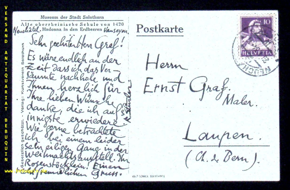STÜRLER, Albrecht Ludwig Rudolf von: 15zeilige eigenhändige signierte Ansichtskarte an den Maler Ernst Graf. Bern, 1934. sauber mit Briefmarke gelaufen. Kartenmotiv: Madonna in den Erdbeeren. Die Familie von Stürler ist eine Berner Patrizierfamilie, welche seit dem 14. Jahrhundert das Burgerrecht der Stadt Bern besitzt und heute der Gesellschaft zu Ober-Gerwern und der Zunftgesellschaft zum Affen angehört.