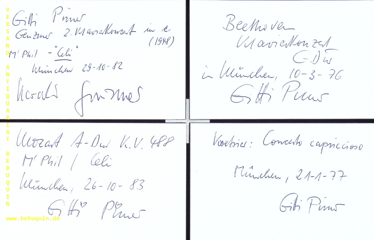 PIRNER, Gitti (Pianistin): 8 eigenhändig signierte und datierte Autogrammkarten. München (Philharmonie), 1974 – 1986. 8 x 12,5 cm. 8 Karteikarten. Gitti Pirner (* 26. Juni 1943 in Immenstadt im Allgäu) ist eine deutsche Pianistin und emeritierte Hochschullehrerin der Hochschule für Musik und Theater München (HMT). (Wikipedia)