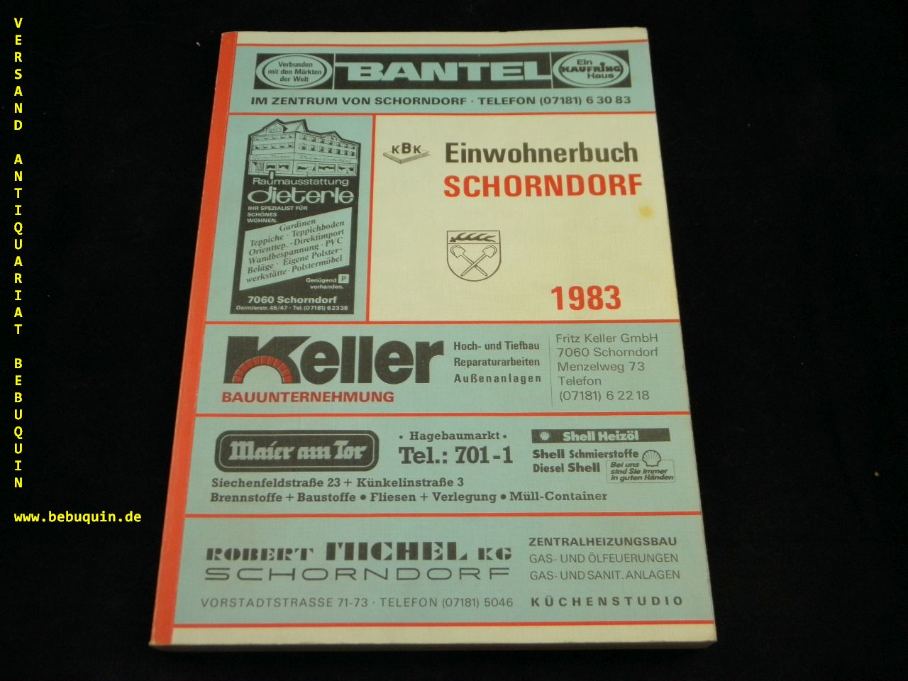 SCHORNDORF.– EINWOHNERBUCH SCHORNDORF 1983.– Karlsruhe (KBK), 1983. Gr. 4°. 16, 302 S. mit illustriertem Teil ill. OKart. feines Ex.