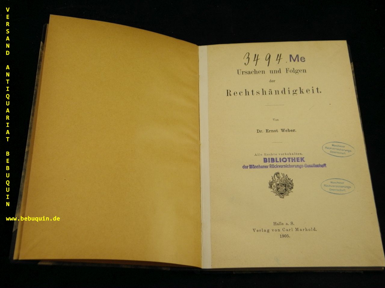MEDIZIN.– WEBER, Ernst: Ursachen und Folgen der Rechtshändigkeit. Halle (Marhold), 1905. Gr. 8°. 116 S. mit Abb. HLn der Zeit. Bibliotheksstempel. seltene EA.