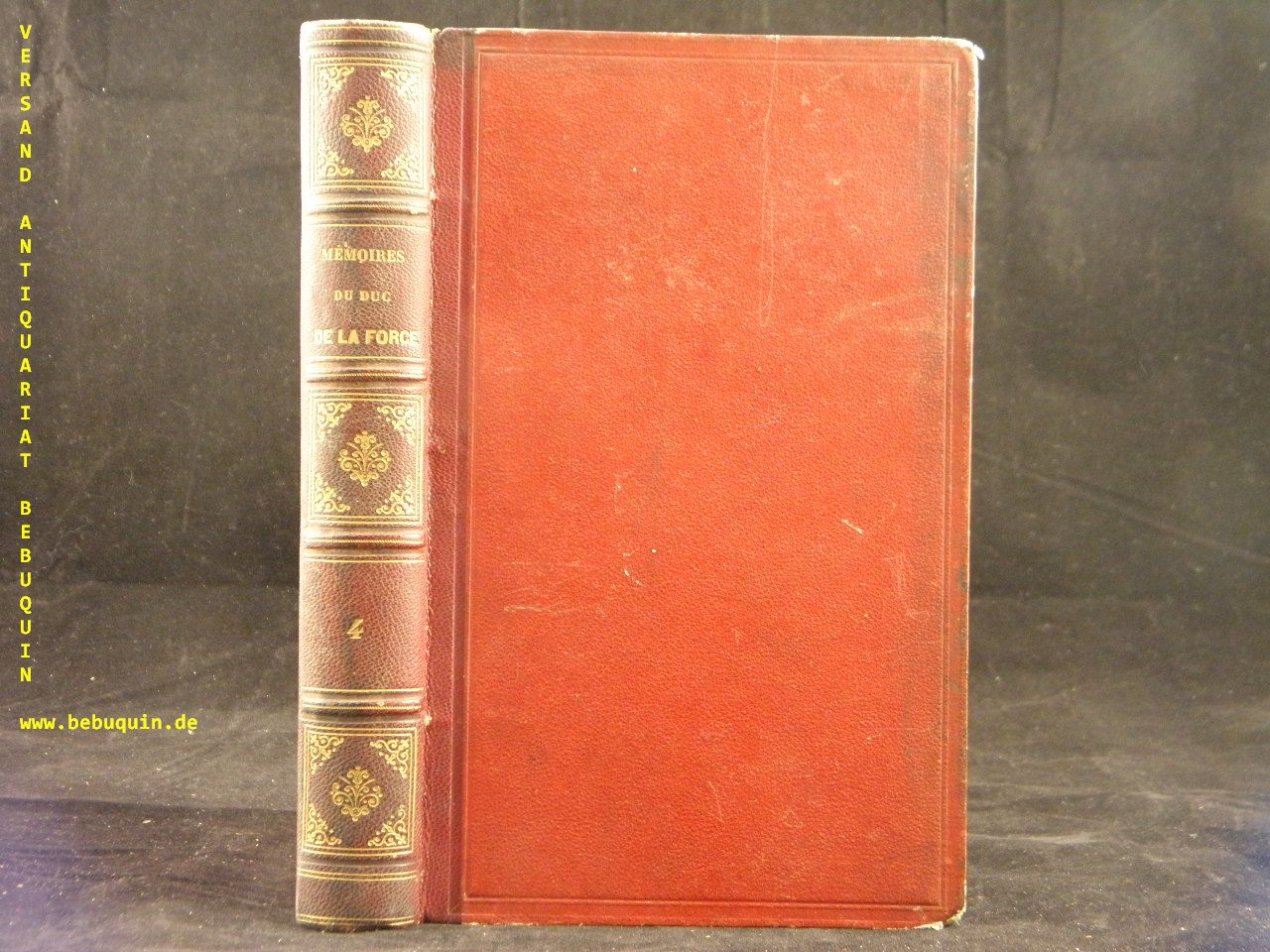 GRANGE, Marquis de la: (Hrsg.) Mémoires authentiques de Jacques Nompar de Caumont, duc de La Force, maréchal de France, et de ses deux fils les marquis de Montpouillan et de Castelnaut. Suivis de Documents curieux et de Correspondances inédites de Jeanne d’Albret, Henri III, Henri IV, Catherine de Bourbon, Louis XIII, Marie de Médicis, Condé, Sully, Villeroy, Fresnes, Pontchartrain, Bouillon, Biron, d’Ornano, Montespan, Matignon, du Plessis-Mornay, Rohan, Schomberg, Châtillon, d’Effiat, Feuquières, Richelieu. Pour faire suite à toutes les collections de mémoires sur l’histoire de France. Tome IV (von 4). Paris (Charpentier), 1843. Gr. 8°. 605 S. rotes OHLdr mit goldgeprägtem Rücken. schönes Ex. 1. Aufl. dieser Ausgabe. Jacques Nompar de Caumont (* 30. Oktober 1558; † 10. Mai 1652) war Seigneur, Marquis, 1. Herzog von La Force, Pair von Frankreich, außerdem Gouverneur von Béarn, Vizekönig von Navarra[1] unter König Heinrich IV. sowie Maréchal de France unter König Ludwig XIII. Er hinterließ umfangreiche Memoiren.