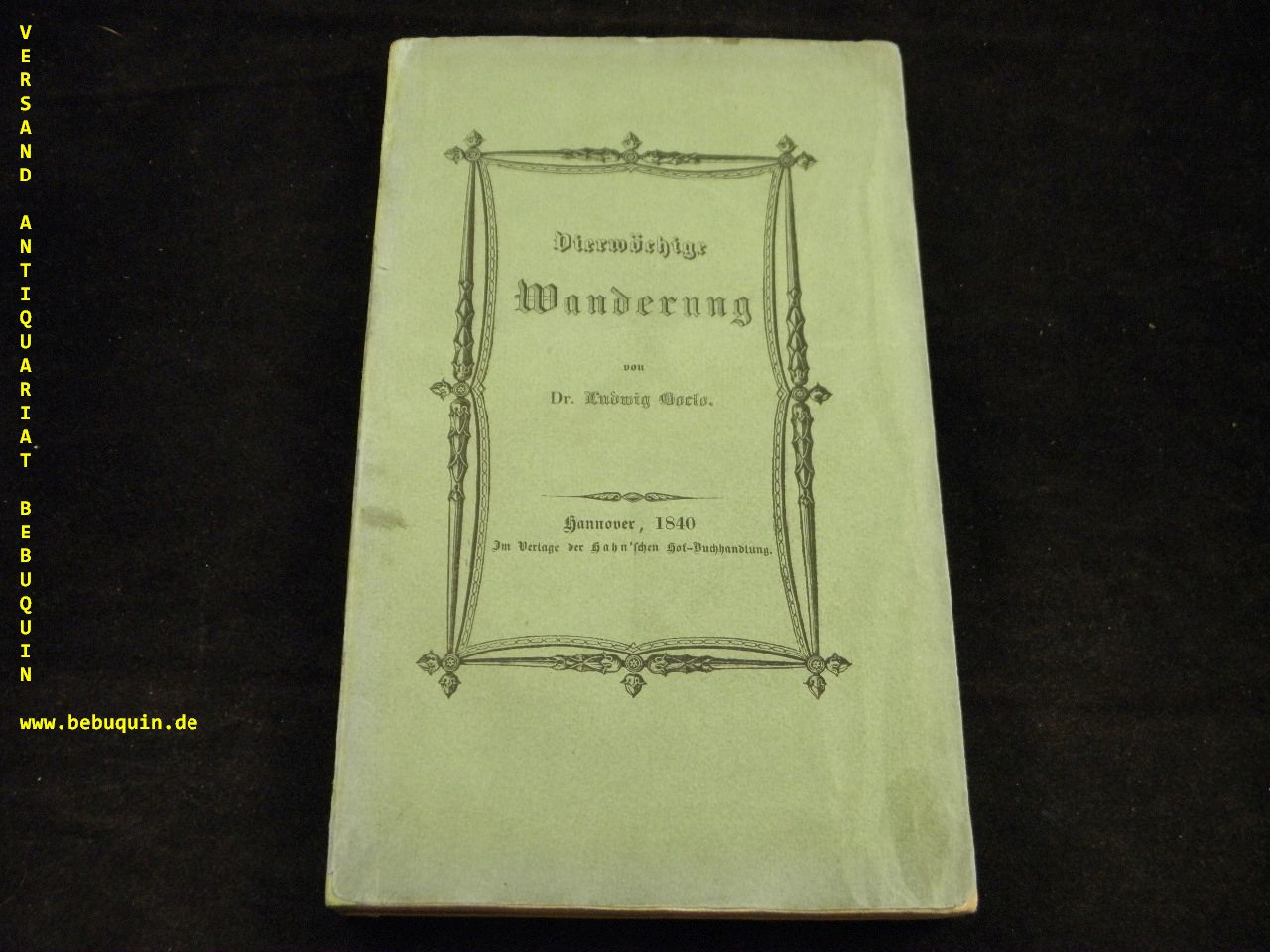 MITTELDEUTSCHLAND.– BOCLO, Ludwig: Vierwöchige Wanderung von Rinteln über Mühlhausen, Gotha, Wunsiedel nach dem Fichtelgebirge und von da zurück über Baireuth, Kulmbach, Koburg etc. Ulm am 29. und 30. Juni 1877. Hannover (Hahn), 1840. VIII, 216 S. ill. Okart. Kanten etwas bestoßen, unaufgeschnitten, insgesamt sehr gut erhalten. sehr seltene EA.