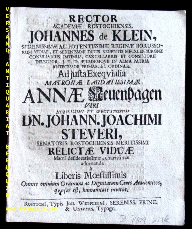 ROSTOCK.– STEVER, Johann Joachim: Rector Academiae Rostochiensis, Johannes de Klein, Serenissimae … Reginae Borussorum Viduae, Et Serenissimi Ducis Regentis Mecklenburgici Consiliarius Intimus, Cancellarius Et Consistorii Director, J.U.D. Ejusdemqve In Alma Patria Antecessor Primar. et Ordinar. Ad justa Exeqvialia Matronae Laudatissimae Annae Neuenhagen Viri Nobilissimi … Dn. Johann. Joachimi Steveri, Senatoris Rostochiensis Meritissimi Relictae Viduae Matri desideratissimae … adornanda â Liberis Moestissimis : Omnes omnium Ordinum … Cives Academicos … invitat. Rostock (Weppling), 1713. kl. 8°. 8 Bl.mit zahlr. gestochenen auch figürlichen Vignetten. ohne Einband. gutes Ex. EA. Trauerrede der Universität Rostock für Anna Neuenhagen, Witwe des Rostocker Ratsherrn Johann Joachim Stever.