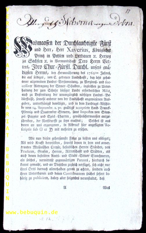 EDIKTE.– XAVER, Prinz von Polen und Litauen, Herzug von Sachsen etc.: Brandtweinsteuer-Edikt. “…Steuer für Land, Tranck, Ordinaire Weine, Ausländische Brandteweine etc.″ Dresden, 9.12.1765. 34 x 21 cm. 8 Bl. auf Hadernbütten mit gestochenen Majuskeln unterzeichnet von Frantz Adolph von Rechenberg, Zeibig, Klette, Börner, Rudolph Graf von Bünau. feines Ex. Franz Xaver Albert August Ludwig Benno von Sachsen und Polen, Graf von der Lausitz (* 25. August 1730 in Dresden; † 21. Juni 1806 in Zabeltitz); aus dem Hause der albertinischen Wettiner stammender Prinz von Sachsen und Polen sowie Regent (Administrator) des Kurfürstentums Sachsen von 1763 bis 1768.