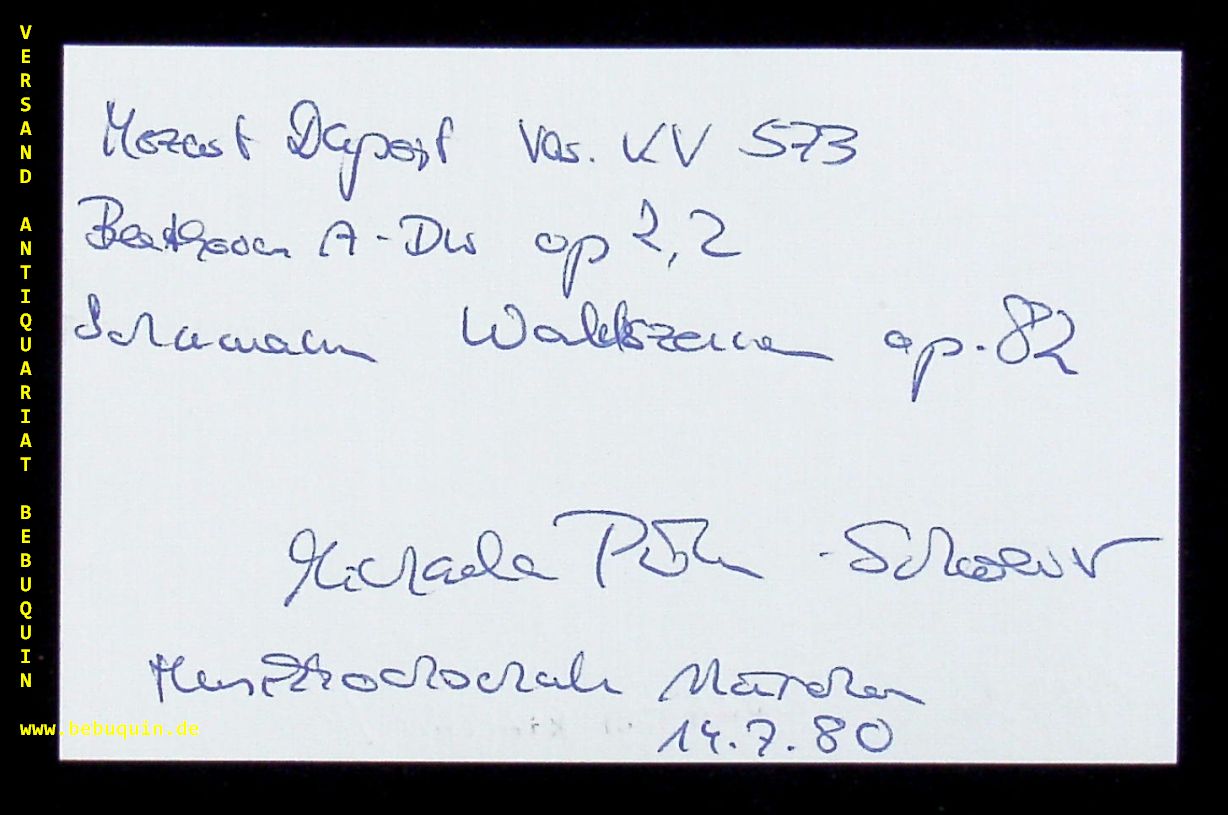PÜHN, Michaela (Pianistin): (hier Pühn-Schwerer) eigenhändig signierte und datierte Autogrammkarte. München (Herkulessaal), 14.7.1980. 8 x 12,5 cm. Karteikarte. Michaela Pühn wurde in Heidenheim an der Brenz geboren und begann im Alter von vier Jahren bei ihrer Mutter mit dem Klavierspiel.