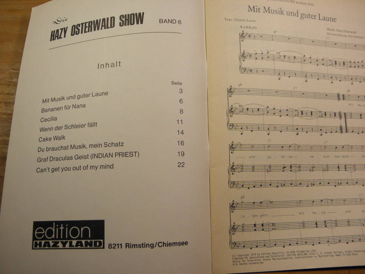 SONGBOOKS.– HAZY OSTERWALD: Die Hazy Osterwald Show. Band 6. Gesang und Klavier. Rimsting (Hazyland), 1974. 4°. 22 S. mit Noten. ill. OKart. gutes Ex. EA.