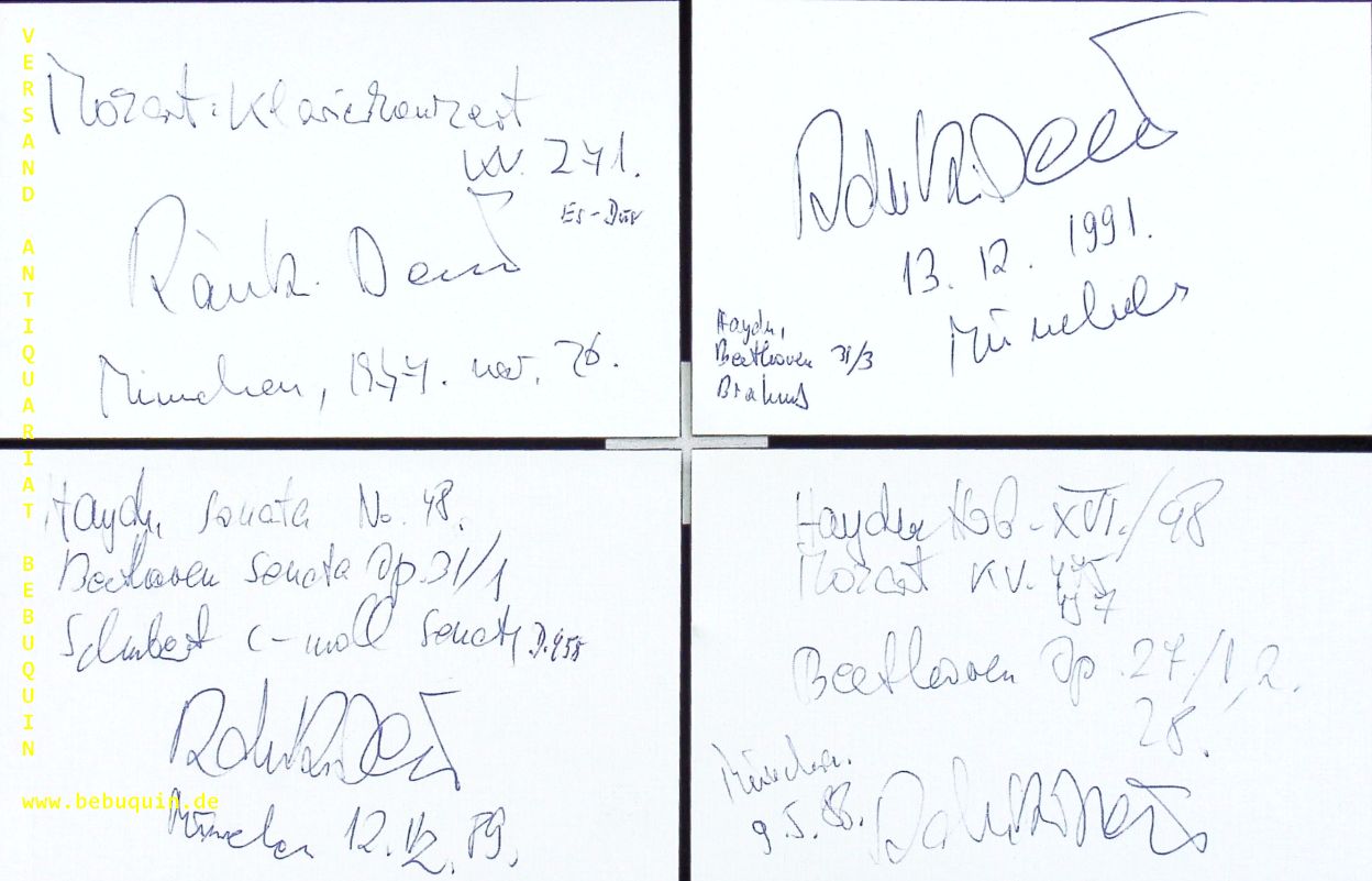 RANKI, Dezsö (Pianist): 5 eigenhändig signierte und datierte Autogrammkarten. München (Herkulessaal), 1977 – 1991. 8 x 12,5 cm. 5 Karteikarten. Dezso Ránki (* 8. September 1951 in Budapest) ist ein ungarischer Pianist. Zusammen mit Zoltán Kocsis und András Schiff gilt er als einer der besten ungarischen Pianisten seiner Generation. (Wikipedia)