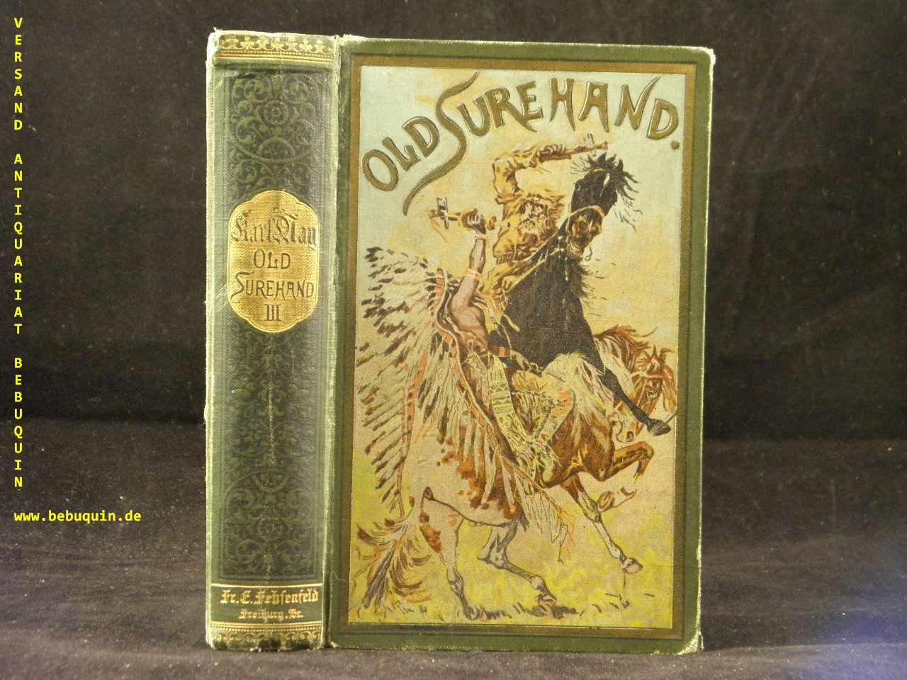 MAY, Karl: Old Surehand. 3. Band. Reiseerzählungen. 31.– 35. Tsd. Freiburg (Fehsenfeld), (1905). 566 (5) S. ill. grünes OLn. (DB 66.) leicht schief gelesen, Ecken etwas berieben, insgesamt gut erhalten. = Gesammelte Reiseerzählungen, Bd. XIX. Seltene Einbandvariante. Plaul 286.5.