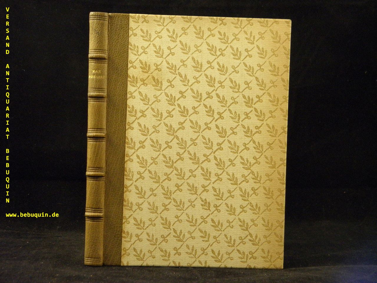 VOEGELI, Max: Amapali und der Erhabene. Eine indianische Erzählung. Olten (Bücherfreunde), 1948. 75 (1) S. auf Marais-Bütten. Braunes Orig.-HMaroquin Oasenziegenleder mit goldgepr. Rückentitel und Kopfgoldschnitt als Handeinband der Werkstatt Willy Schaffner im OSchuber. tadellos. = 40. Veröffentlichung der Oltner Bücherfreunde. Nr. 66 von 180 Ex. der Vorzugsausgabe mit der eigenhändigen Signatur des Dichters auf Vortitel.