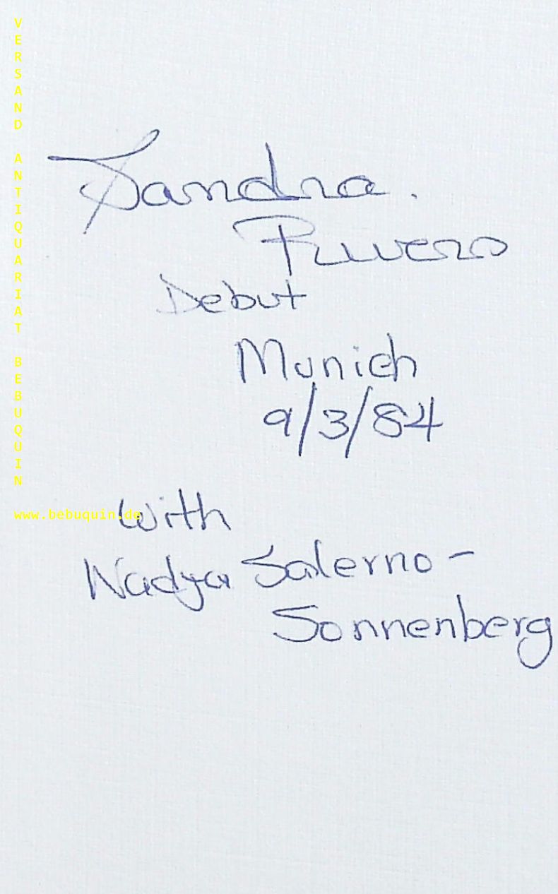 RIVERS, Sandra (Pianistin): eigenhändig signierte und datierte Autogrammkarte. München (Philharmonie), 9.3.1984. 8 x 12,5 cm. Karteikarte. Pianist Sandra Rivers enjoys a reputation today as one of the foremost performing artists of her generation. She has concertized throughout the world and has appeared at the Mostly Mozart Festival at Lincoln Center, Tanglewood, Aspen, the Schleswig-Holstein Festival, the Kennedy Center and on the Great Performers Series at Lincoln Center.