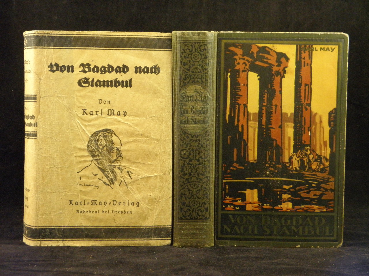 MAY, Karl: Von Bagdad nach Stambul. Reiseerzählung. 177.– 187. Tsd. Radebeul (Karl May), (1932). 644 S. farb. ill. OHLn. mit OUmschl. Umschlag gebräunt und teilweise hinterlegt, Rücken geblichen. = Gesammelte Werke, Bd. 3. Hermesmeier / Schmatz GW 3.28.