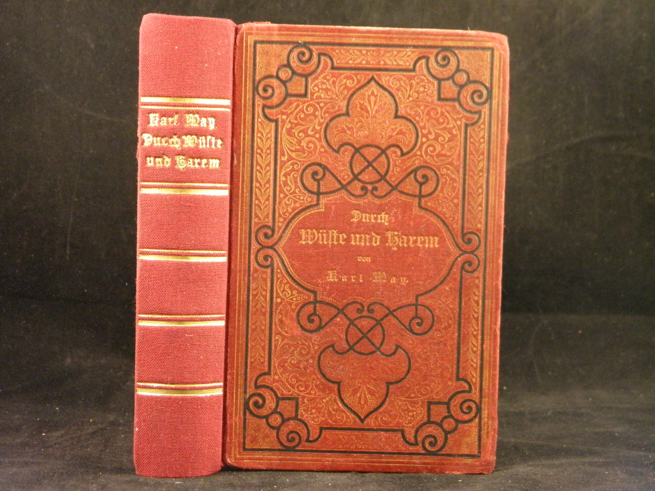 MAY, Karl: (Hier Carl May) Durch Wüste und Harem. Reiseerlebnisse. 3. Aufl. 11. – 15. Tsd. Freiburg (Fehsenfeld), 1893. 634 S. mit den Eichenlaubvorsatzpapieren. ill. rotes OLn. (rote Klassiker-Ausgabe) mit farbgleichem goldgeprägtem Leinenrücken fachmännisch restauriert, NaV, innen leicht fingerspurig und gelockert. = Gesammelte Reiseerzählungen, Bd. I. letzte Auflage dieses Titels ( Plaul 226.3) von allergrößter Seltenheit. In diesem Einband (Jendrewski 163) wohl kein zweites Mal zu finden. Dass es sich bei den roten Leinenbänden um eine originale Verlagsaustattung Fehsenfelds handelt, hat C. Blau in den KMG No 106 trefflich ausgeführt. Durch eine von ihm veranstaltete Umfrage konnte die Existenz von „28 Exemplaren der roten Fehsenfeld-Bände gesichert“ werden, die sich auf 15 Titel verteilen. Die hier vorliegende Auflage befindet sich dabei. Von musealer Seltenheit.