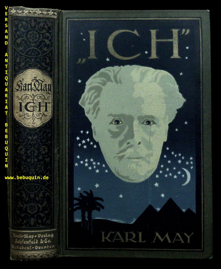 MAY, Karl: „ICH“. 14. Aufl. (d.i. 66.– 70. Tsd.) Aus Karl May’s Nachlaß. Hrsg. von E.A. Schmid. Radebeul (Karl May), (1938). 548 (2) S. mit zahlr. Bildtafeln. farb. ill. OLn. mit OUmschl. (SU5). farbstarker Einband mit glänzendem Rückengold, leicht schief gelsen = Gesammelte Werke, Bd. 34. Hermesmeier / Schmatz GW 34.14.