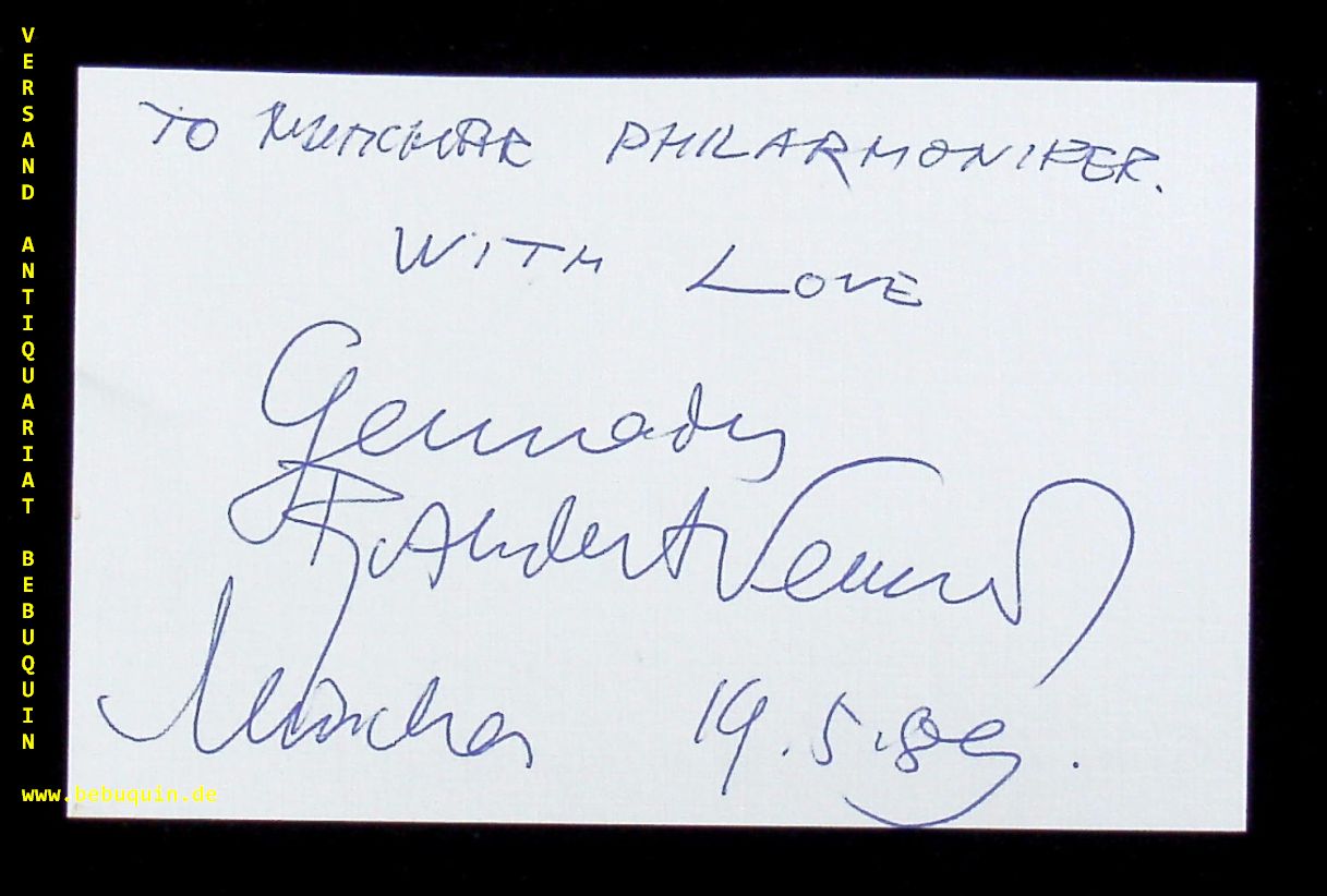 ROSHDESTWENSKIJ, Gennadij (Dirigent). eigenhändig signierte und datierte Autogrammkarte: To Munchar Philharmoniker With love. München, 19.5.1989. 8 x 12,5 cm. Karteikarte. Gennadi Nikolajewitsch Roschdestwenski (* 4. Mai 1931 in Moskau, Sowjetunion; † 16. Juni 2018 ebendort) war ein sowjetischer bzw. russischer Dirigent. Er galt als einer der bedeutendsten Interpreten russischer und zeitgenössischer sowjetischer Musik. Er führte oft ausgedehnte Tourneen durch Europa, Japan und die USA durch. Zu den Werken, die ihm gewidmet wurden, zählt u. a. die 1. Sinfonie von Alfred Schnittke. (Wikipedia)
