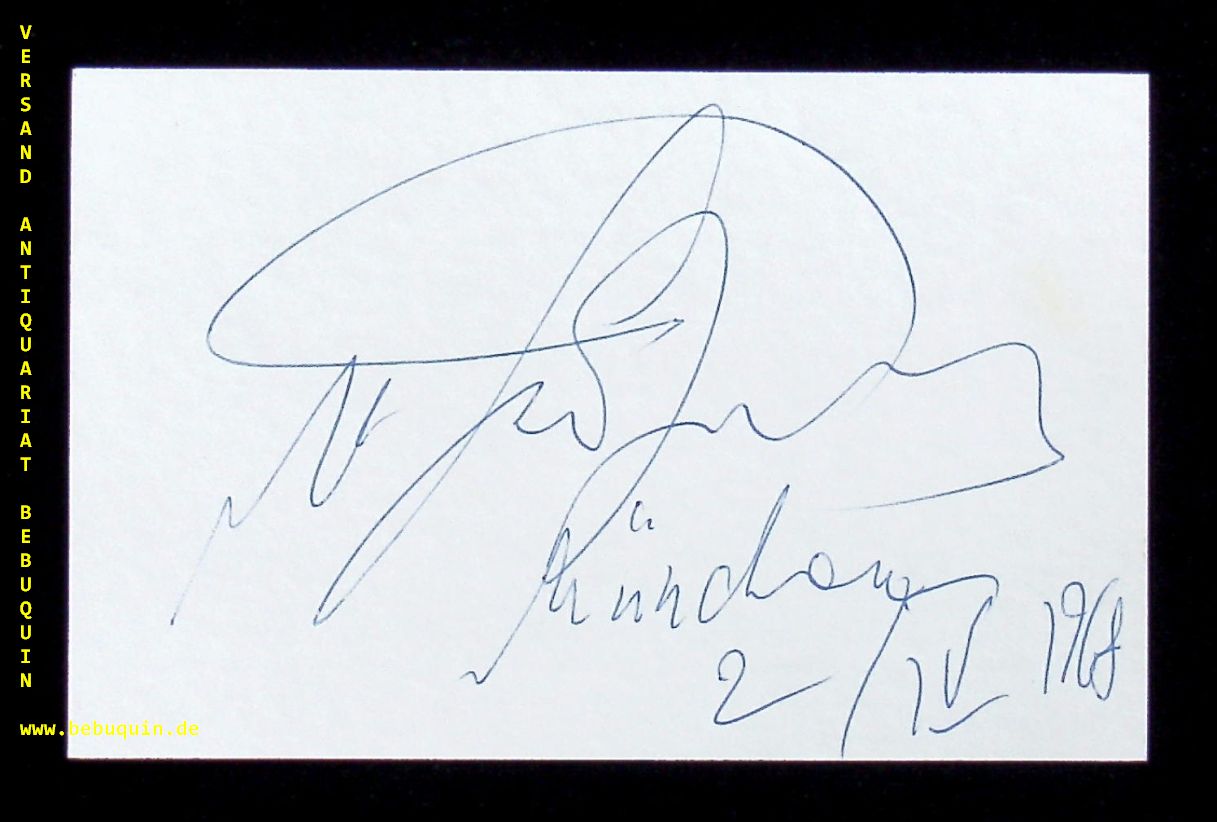 ROSTROPOWITSCH, Mstislaw (Cellist): eigenhändig signierte und datierte Autogrammkarte. München, 2.4.1968. 8 x 12,5 cm. Karteikarte. Mstislaw Leopoldowitsch Rostropowitsch (* 27. März 1927 in Baku; † 27. April 2007 in Moskau) war ein russischer Cellist, Dirigent, Pianist, Komponist und Humanist. Er gilt als einer der bedeutendsten Cellisten der Geschichte. (Wikipedia)