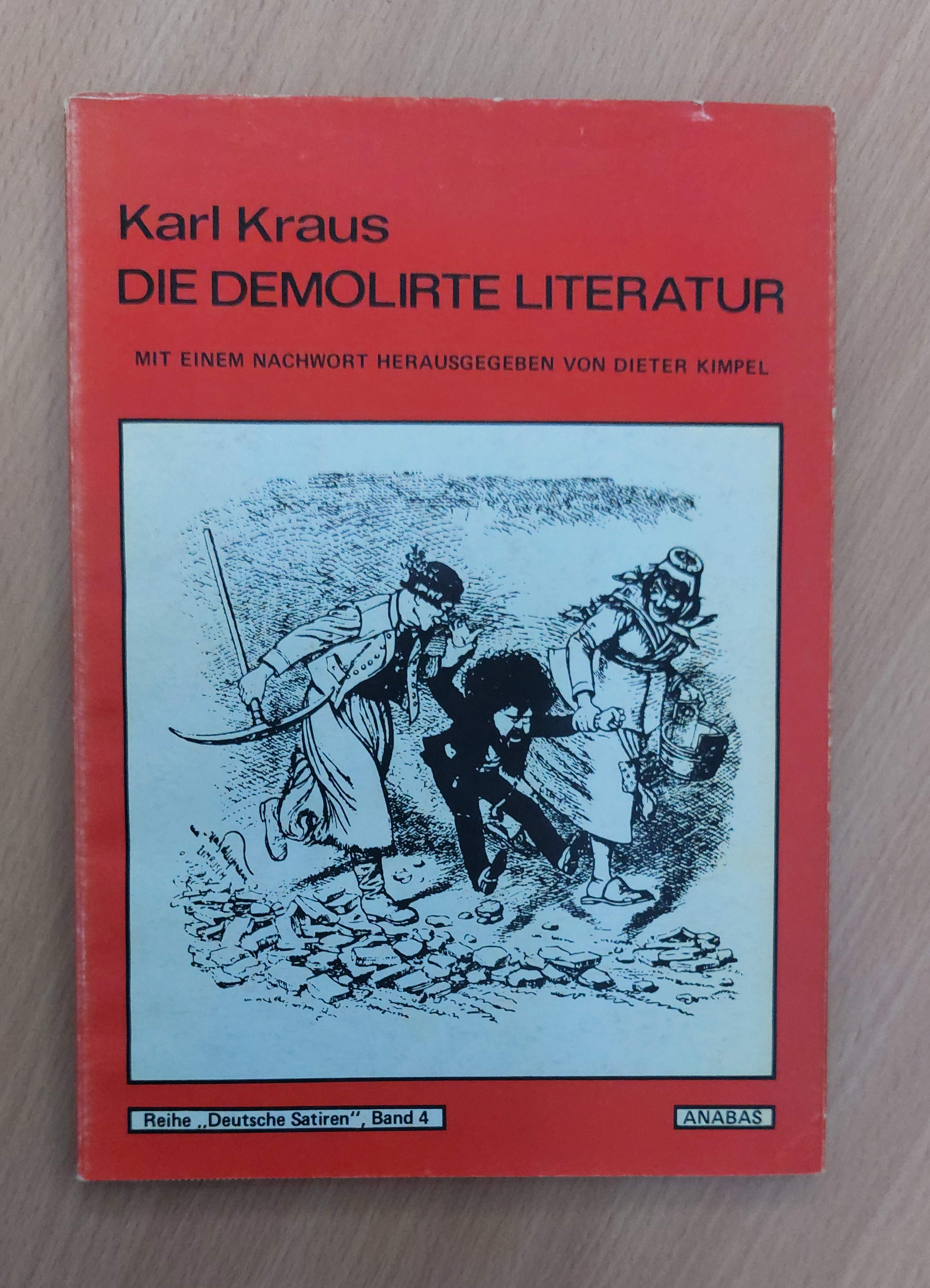 KRAUS, Karl: Die demolirte Literatur. Mit einem Nachwort hrsg. von Dieter Kimpel. Steinbach (Anabas-Verlag Kämpf), 1972. 68 S. ill. OKart. NaT. = Reihe deutsche Satiren, Bd. 4. 1. Aufl. dieser Ausgabe.
