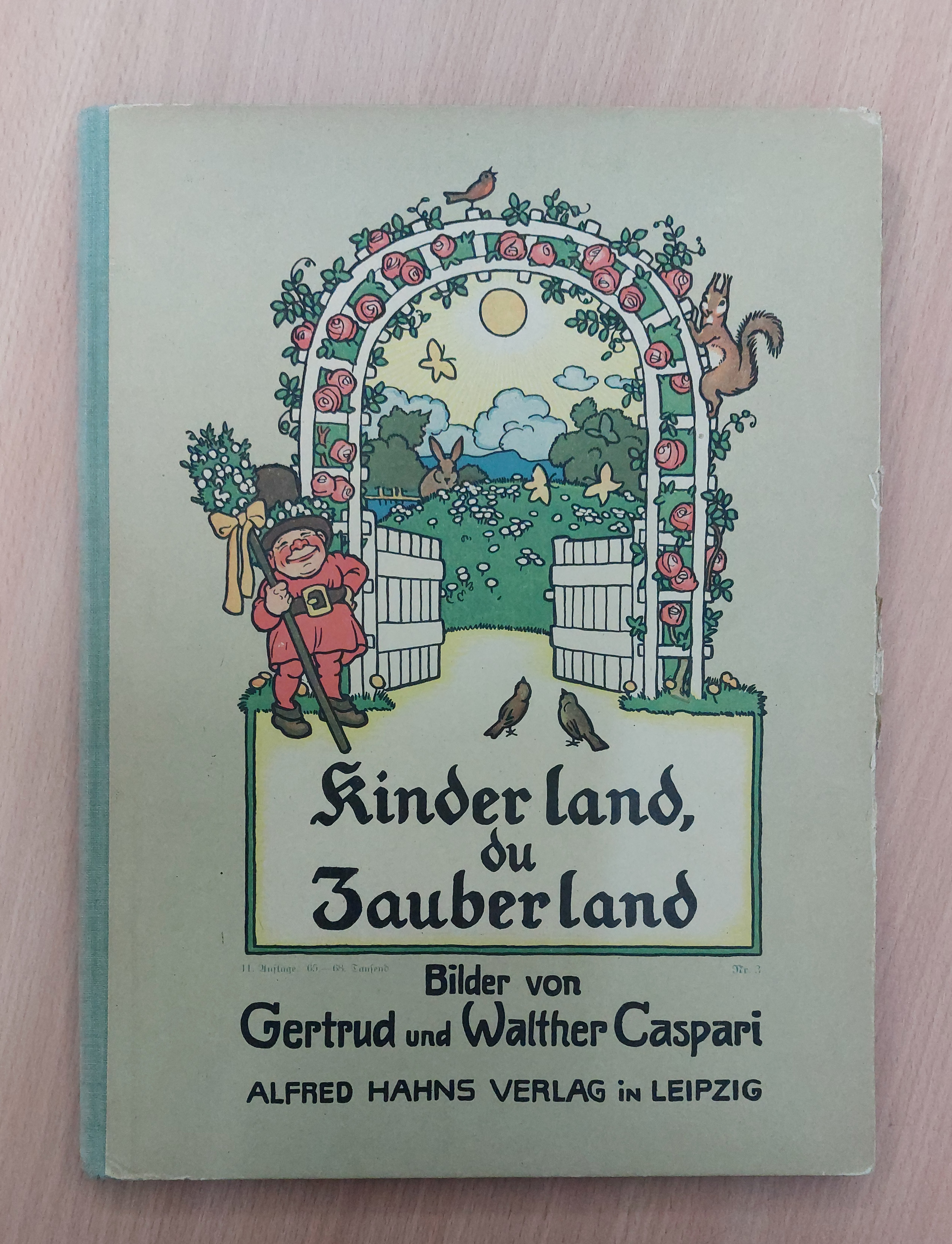 CASPARI, Gertrud + Walther: Kinderland du Zauberland. Schöne Kinderlieder aus neuer und neuester Zeit. 11. Aufl. Leipzig (Hahn / Sell), (1920). 4°. 32 S. mit farb. Bildern von Gertrud und Walther Caspari. farb. ill. OHLn. Kanten leicht berieben, sonst feines Ex. Neubert 8.1.11.