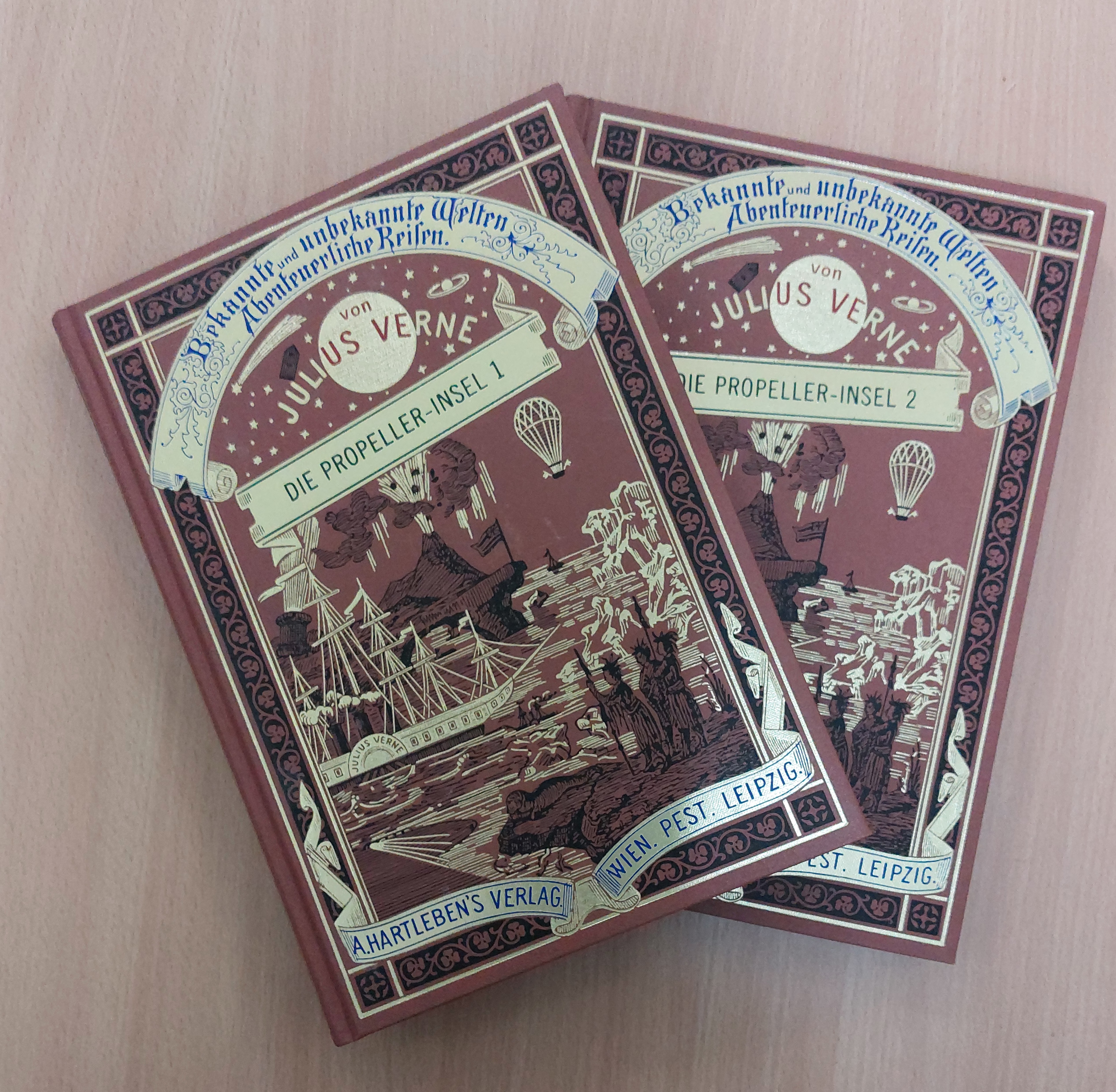 VERNE, Julius: Die Propeller-Insel. Nachdruck der Ausgabe im Hartleben Verlag von 1897. 2 Bände. Stuttgart, 1991. Gr. 8°. 391 S. mit 81 Illustrationen. OLn. mit reicher Gold- und Schwarzprägung sowie Farbschnitt. wie neu. = Bekannte und unbekannte Welten, Bd. 67- 68.