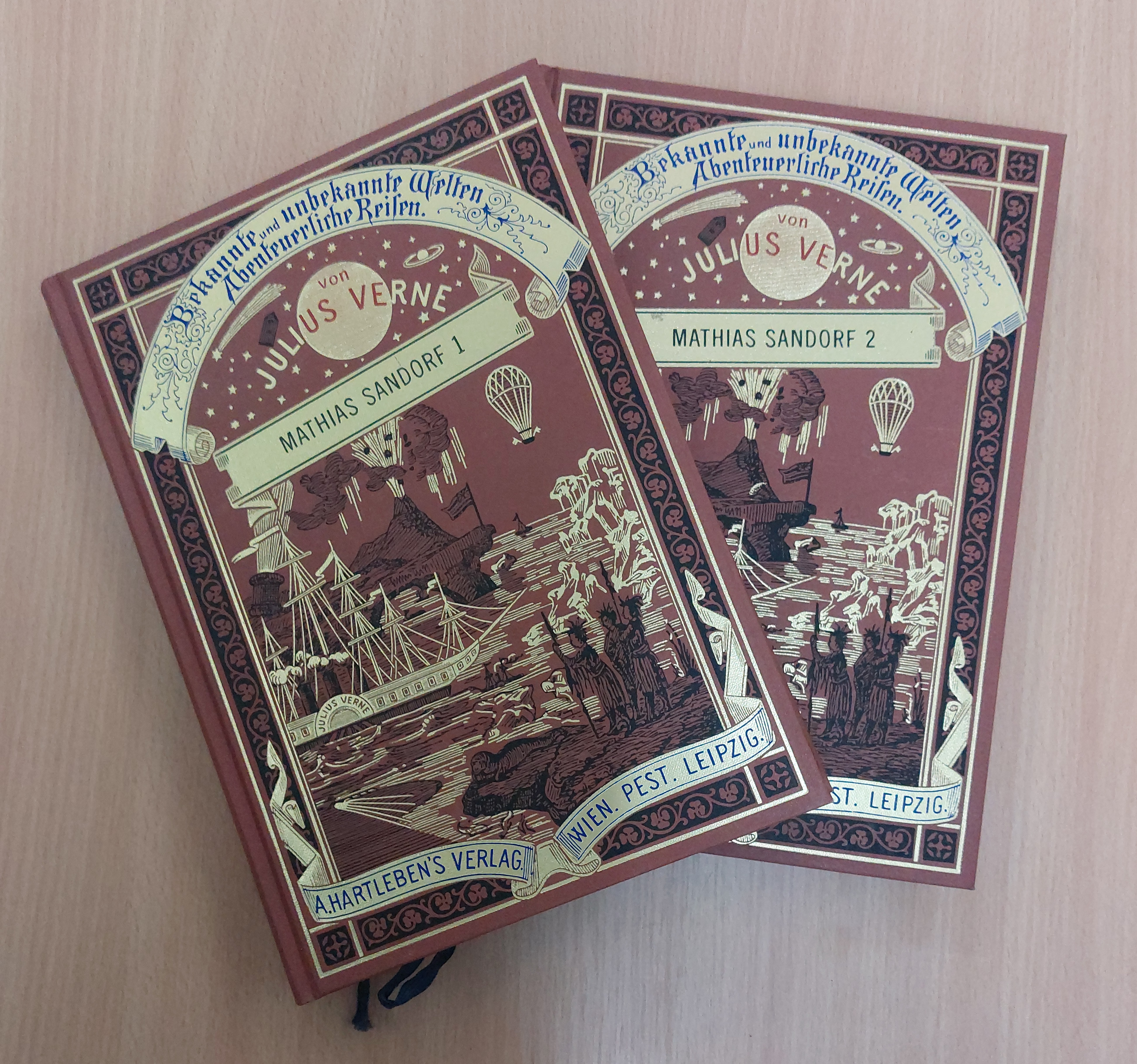 VERNE, Julius: Mathias Sandorf. D.v. Gisela Geisler. 2 Bände. Stuttgart (DB), 1979. Gr. 8°. 471 S. mit sämtlichen Textabb. Rotes Originalganzleinen mit prachtvoller blau-schwarzer Deckelillustration sowie Deckel- und Rückengoldprägung, blauem Farbschnitt sowie Lesebändchen. wie neu. = Bekannte und unbekannte Welten, Bd. 47 – 49.