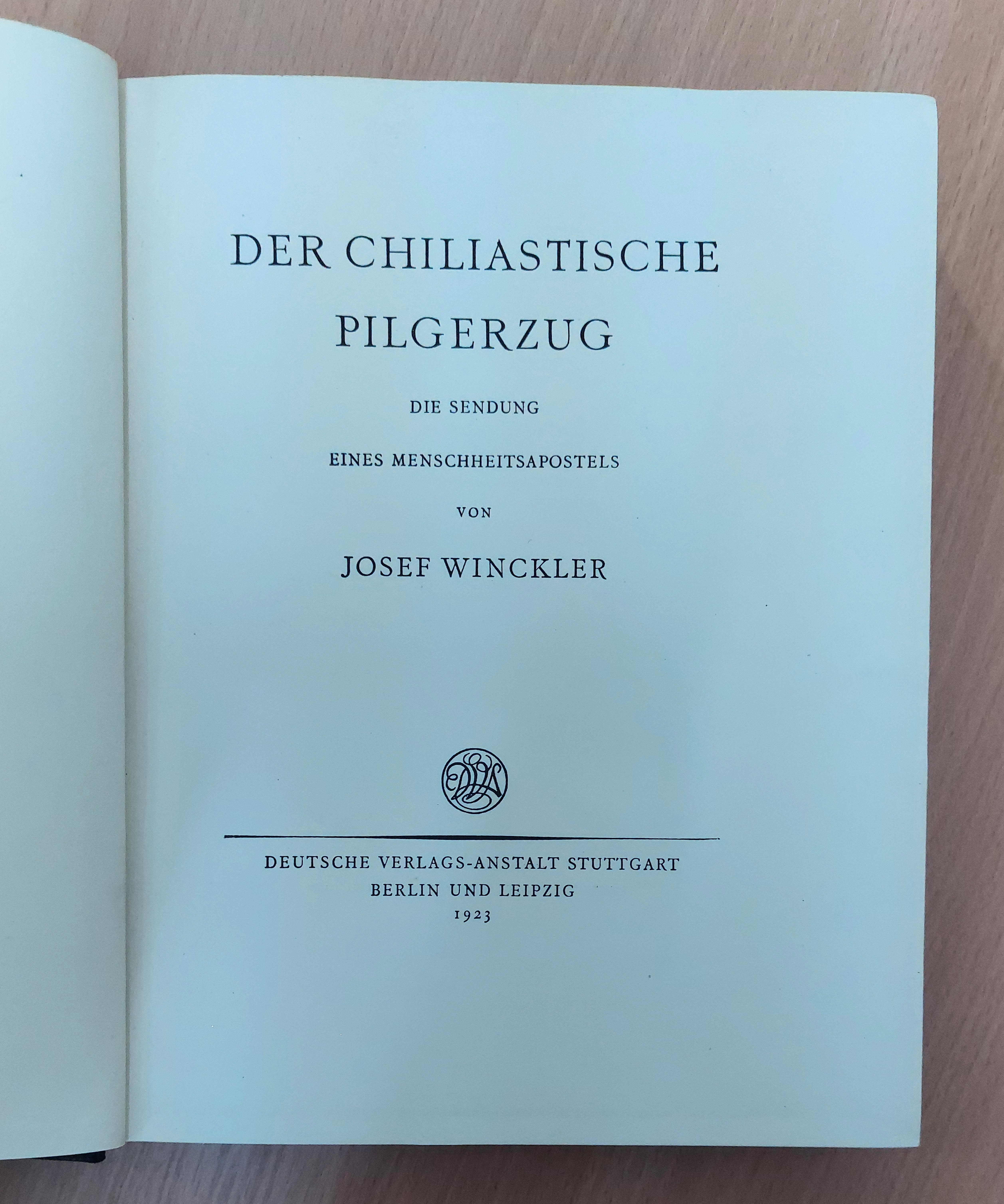 JANSEN.– WINCKLER, Josef: Der chiliastische Pilgerzug. Die Sendung eines Menschenapostels. Stuttgart (DVA), 1923. Gr. 8°. 300 S. und 14 Tafeln mit Kupfertiefdrucken nach Original-Radierungen von Franz M. Jansen OLn. mit rotgeprägter Schrift. feines Ex. 1. Aufl. dieser illustrierten Ausgabe. Lang, Express. Buchillustration 143.