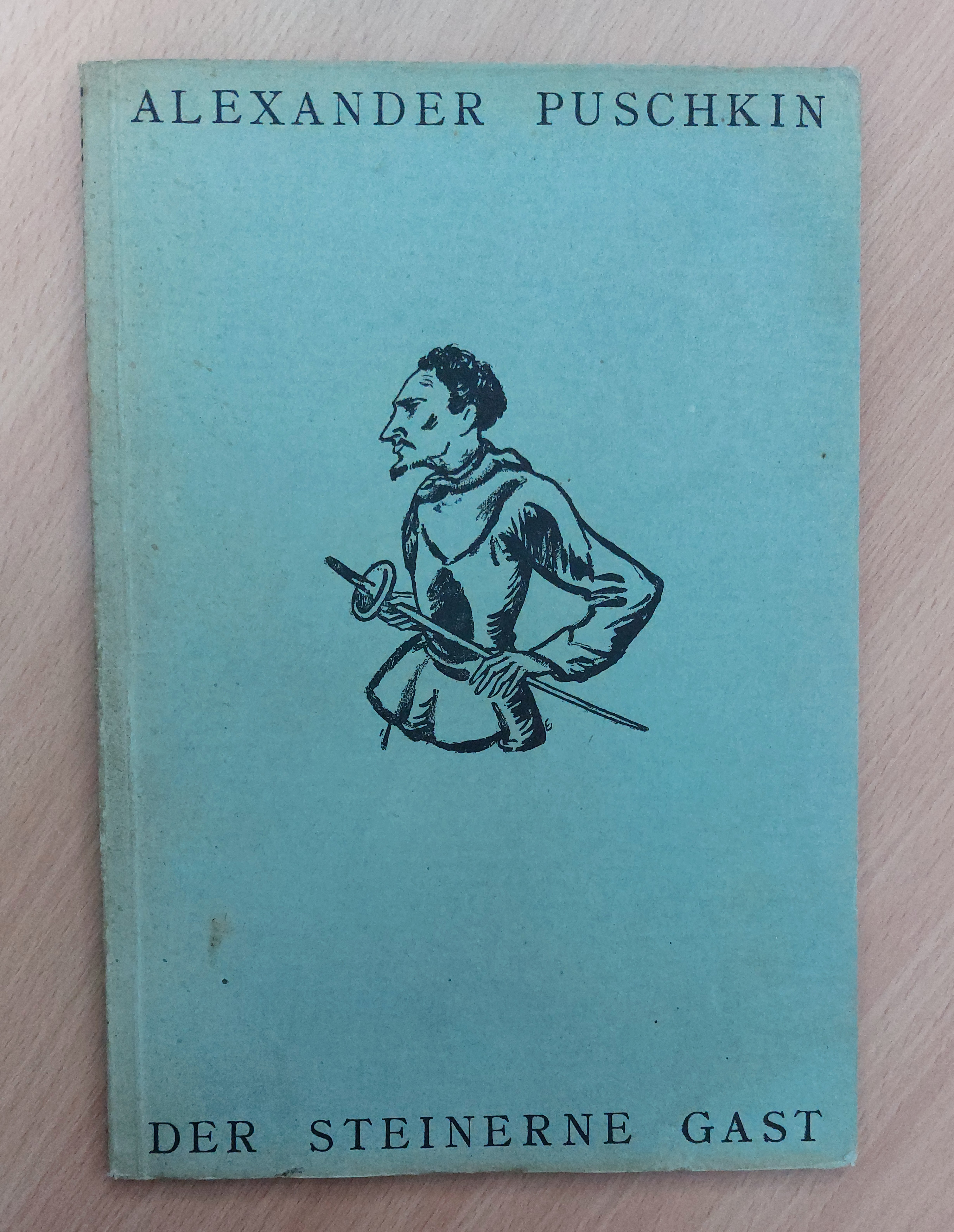 EBERZ.– PUSCHKIN, Alexander: Das steinerne Gast. D.v. Johannes von Guenther. München (Orchis), 1923. Gr. 8°. 41 S. mit 9 Zeichnungen und 8 handkolorierte ganzseitigen O.-Lithos v. Josef Eberz. ill. OKart. Einbandrand leicht gebräunt, sonst sehr feines getrüffeltes Ex. EA mit einer mont. aquarellierten Strichzeichnung von Eberz verso Druckvermerk montiert, wohl ein Entwurf für die geplante Einbandillustration. Ein Unikat.