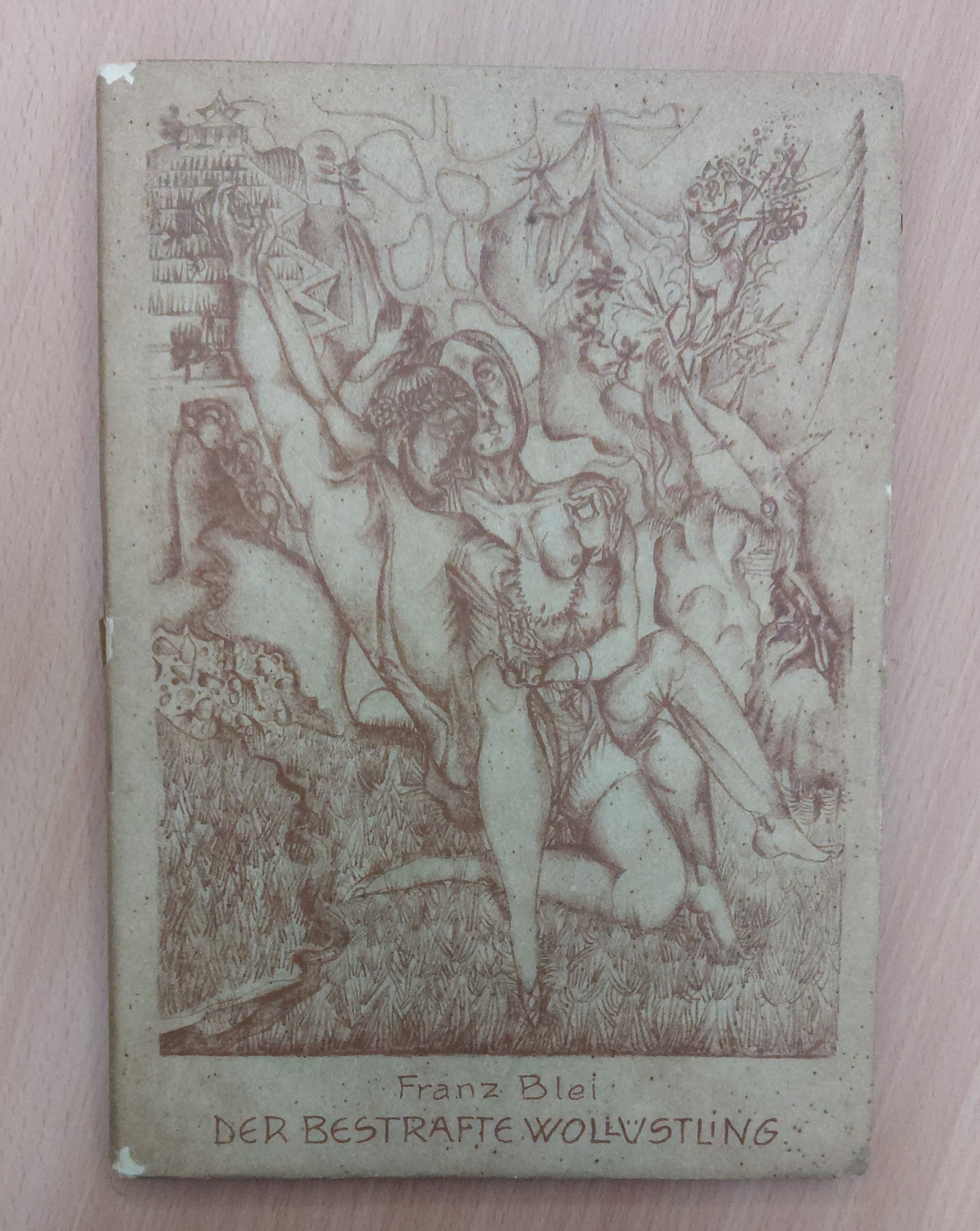 GÜTERSLOH.– BLEI, Franz: Der bestrafte Wollüstling. Arabeske. Wien (Avalun), 1921. 4°. 88 S. OKart mit OUmschl. mit einer Original Lithographie von Paris Gütersloh. Umschlag an den Rändern ganz unwesentlich berieben, insgesamt schönes Ex. = Avalun Tausenddruck, Nr.4. EA WG² 97.