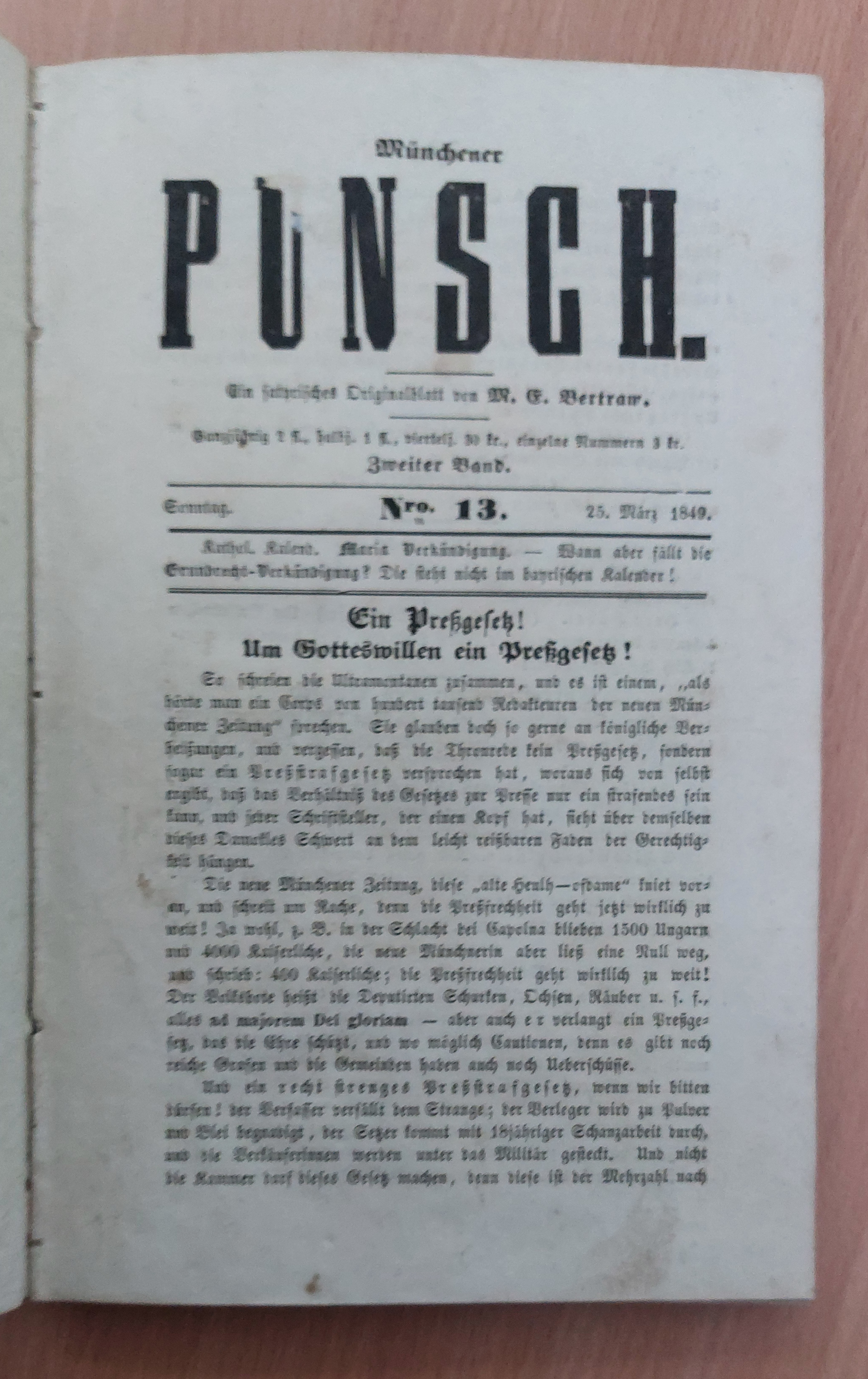 MÜNCHENER PUNSCH.– BERTRAM, M.E.: (d.i. M.E. Schleich) Münchener Punsch. Ein satyrisches Originalblatt. 2. Band. Heft 13 – 52 in 1 Band. München, 1849. S. 49 – 212 mit einigen Abb. Pb der Zeit. gutes Ex. Der Münchener Punsch war eine von bis 1848 bis 1871 in München erscheinende Satirezeitschrift. Er wurde im Revolutionsjahr 1848 ursprünglich als Carnevals-Blatt gegründet, um den Zusammenhang zwischen politischem Karneval und Revolution zu dokumentieren. Im selben Jahr wurde der Untertitel in Ein satyrisches Original-Blatt geändert, um die Zeitschrift von den zahlreich erscheinenden Nachdrucken abzugrenzen. Hier der seltene zweite Band noch ganz unter Eindruck der 48er Revolution.