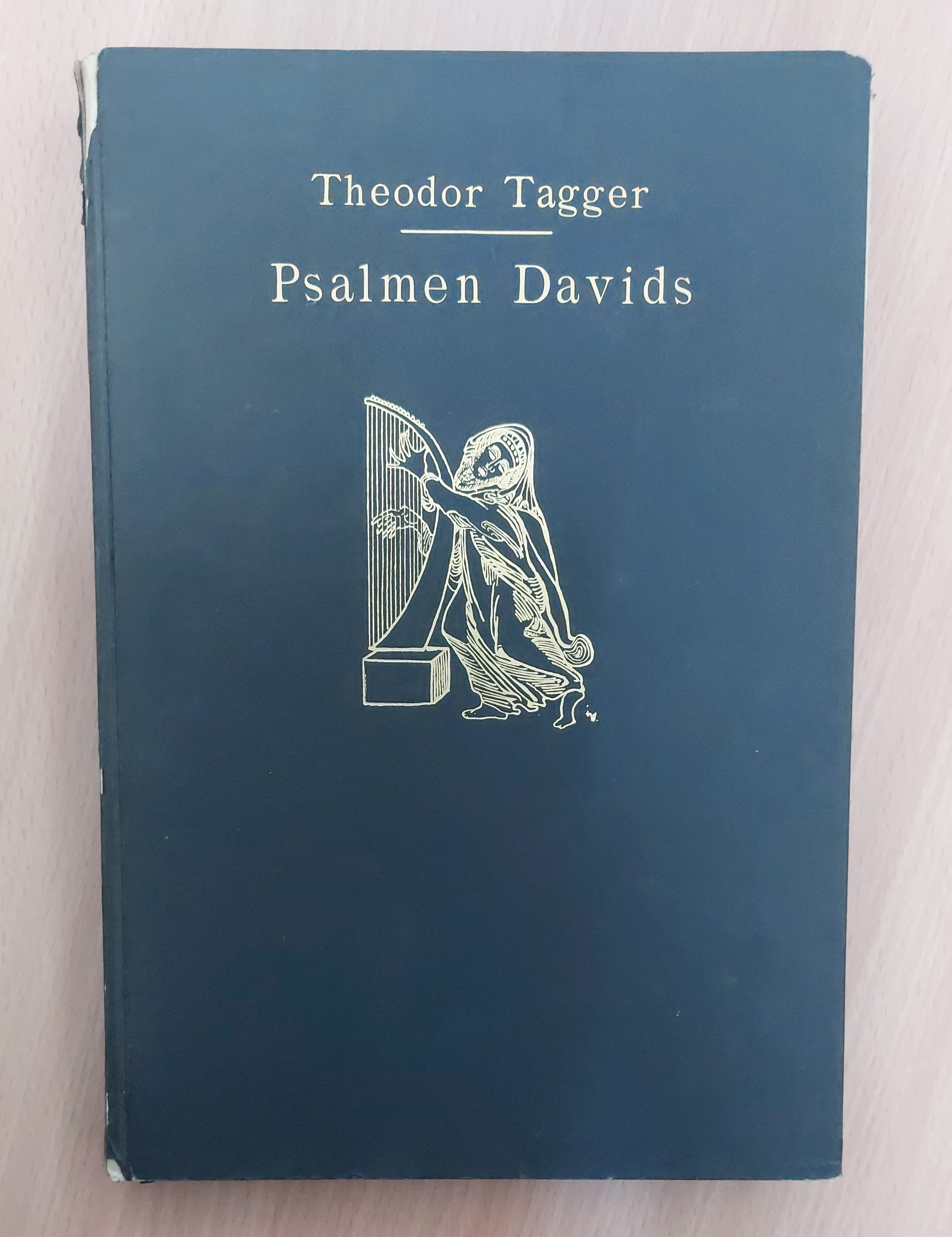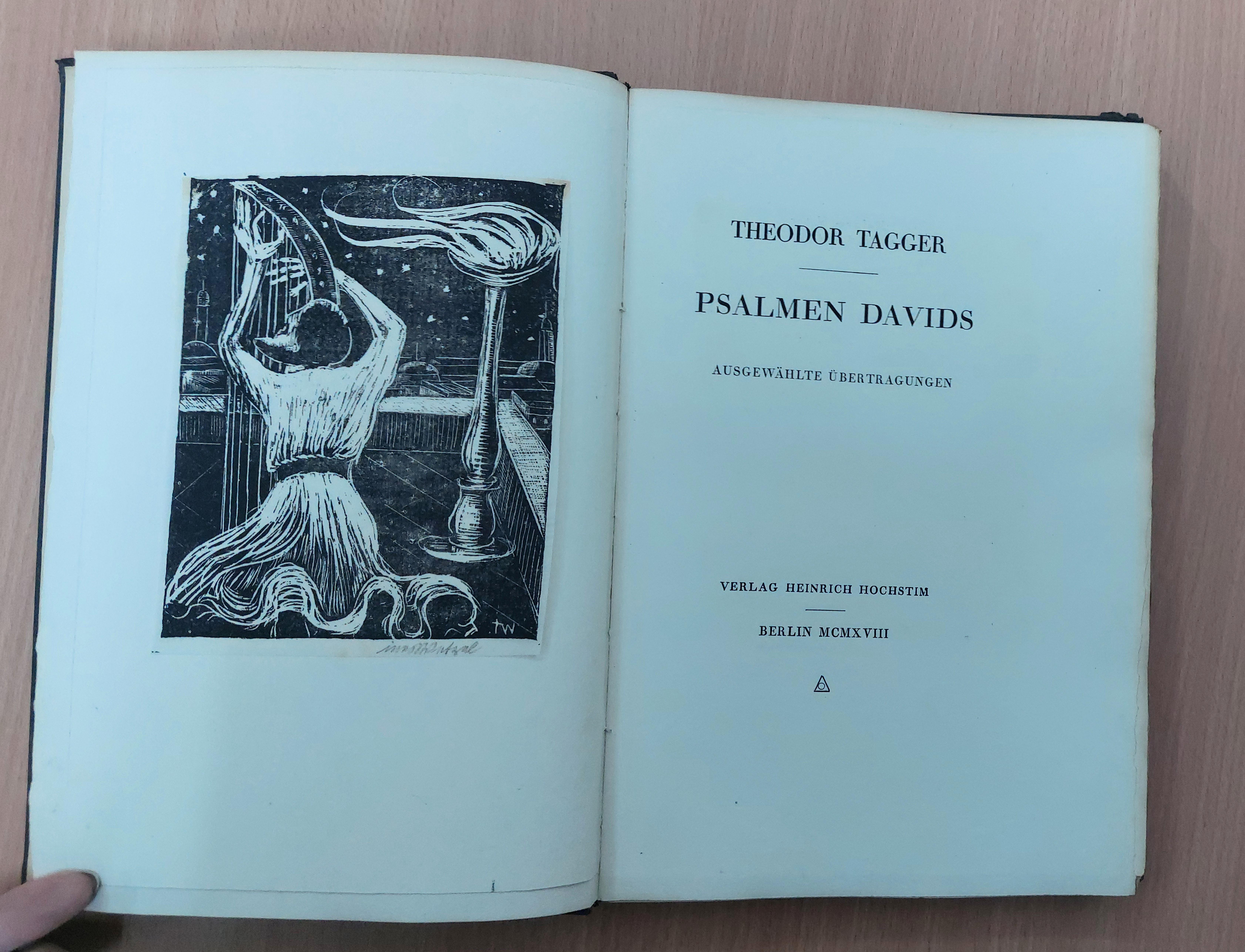 WETZEL.– TAGGER, Theodor: Psalmen Davids. Ausgewählte Übertragungen. Berlin (Hochstim), 1918. 4°. 131 S. auf handgeschöpften Bütten mit einem mont. eigenhändig signierten Linolschnitt auf Seidenpapier von Ines Wetzel als Frontispiz. OPb mit goldgeprägter Deckelvignette. oberes Kap. ca 4 cm angeplatzt, sonst sehr fein erhalten. Nr. V von 50 Ex. der Vorzugsausgabe. Raabe 300/7 kennt diese großformatige getrüffelte Ausgabe nicht.