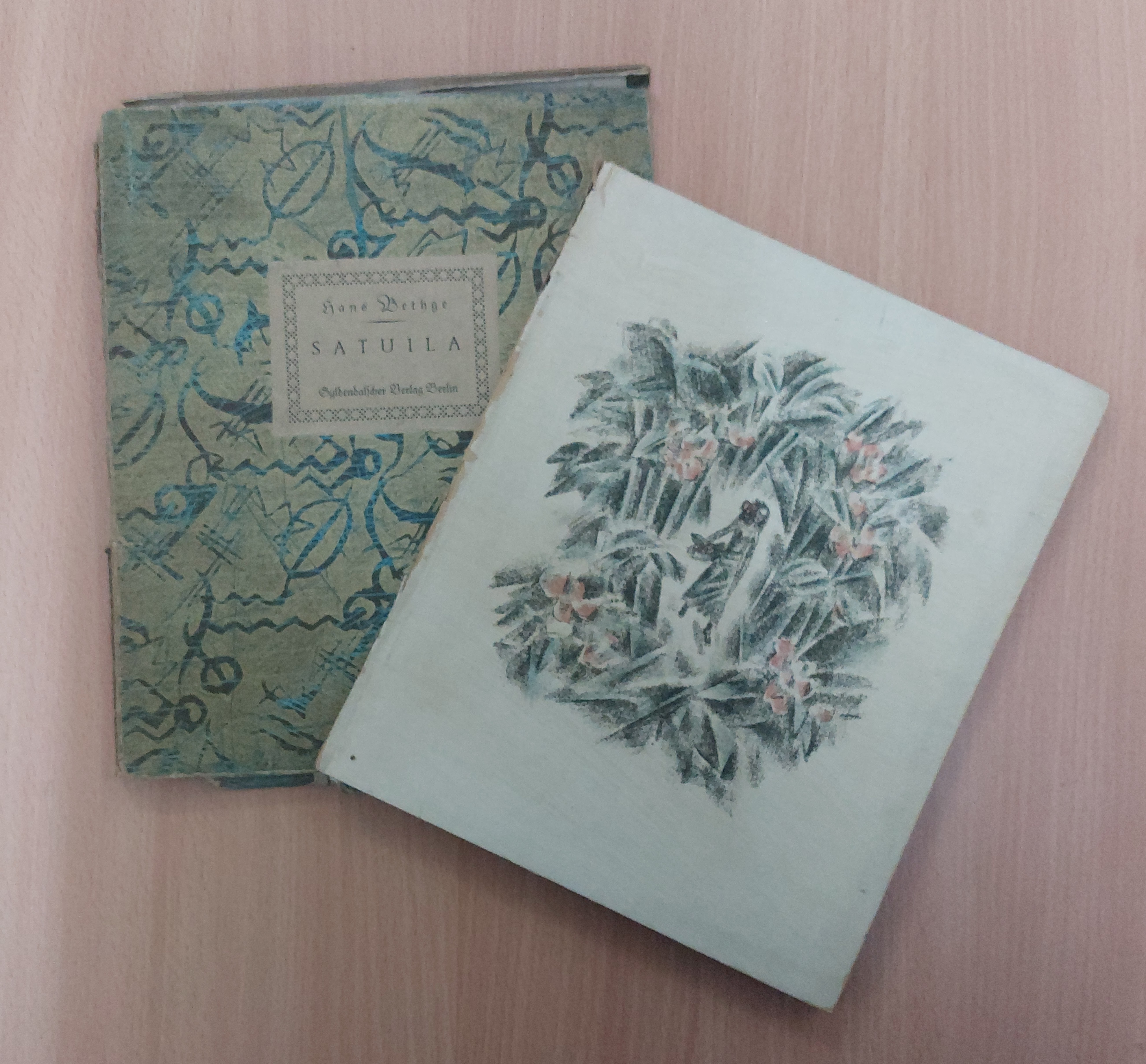 MATHEY.– BETHGE, Hans: Satuila. oder vom Zauber der Südsee. Berlin (Morawe & Scheffelt), 1921. 42 S. auf handgeschöpften holländischen Bütten mit 9 (davon 6 ganzseitigen) Originalradierungen von Georg Alexander Mathey. farb. ill. OSeideneinband von Mathey in OSchuber Rückenkanten bei Schuber und Einband abgerieben, WaV, insgesamt gutes Ex. N r. 141 von 250 numerierten Ex. der EA: