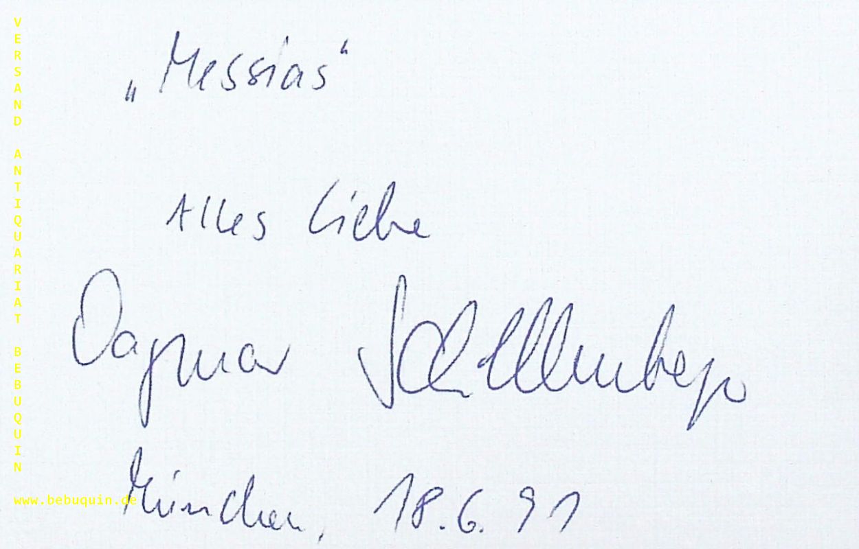 SCHELLENBERGER, Dagmar (Sopran): eigenhändig signierte und datierte Autogrammkarte. München (Philharmonie), 18.6.1991. 8 x 12,5 cm. Karteikarten. Dagmar Schellenberger (* 8. Juni 1958 in Oschatz) ist eine deutsche Opern-, Operetten-, Musical-, Lied- und Konzertsängerin (Sopran). Von 2013 bis 2017 war sie Intendantin und künstlerische Leiterin der Seefestspiele Mörbisch. (Wikipedia)