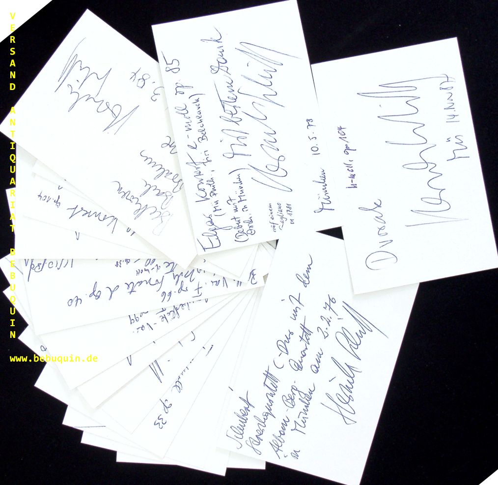 SCHIFF, Heinrich (Cellist): 15 eigenhändig signierte Autogrammkarten mit zahlreichen eigenhändigen Programmbeschreibungen und auch persönlichen Bemerkungen. München (Herkulessaal), 1976 – 1990. 8 x 12,5 cm. 15 Karteikarten. Heinrich Schiff (* 18. November 1951 in Gmunden; † 23. Dezember 2016 in Wien) war ein österreichischer Cellist und Dirigent. Schiff war bei vielen Orchestern und Dirigenten in Europa, den USA und Japan zu Gast. Unter anderem arbeitete er mit den Dirigenten Claudio Abbado, Sergiu Celibidache, Colin Davis, Christoph von Dohnányi, Nikolaus Harnoncourt, Zubin Mehta, Giuseppe Sinopoli und Franz Welser-Möst. Viele Komponisten, darunter Witold Lutoslawski, Hans Werner Henze, Ernst Krenek, Wolfgang Rihm, Franz Hummel, Friedrich Gulda, Hans Zender, Dietmar Polaczek und Otto M. Zykan, schrieben Werke für Schiff, die er uraufführte. (Wikipedia)