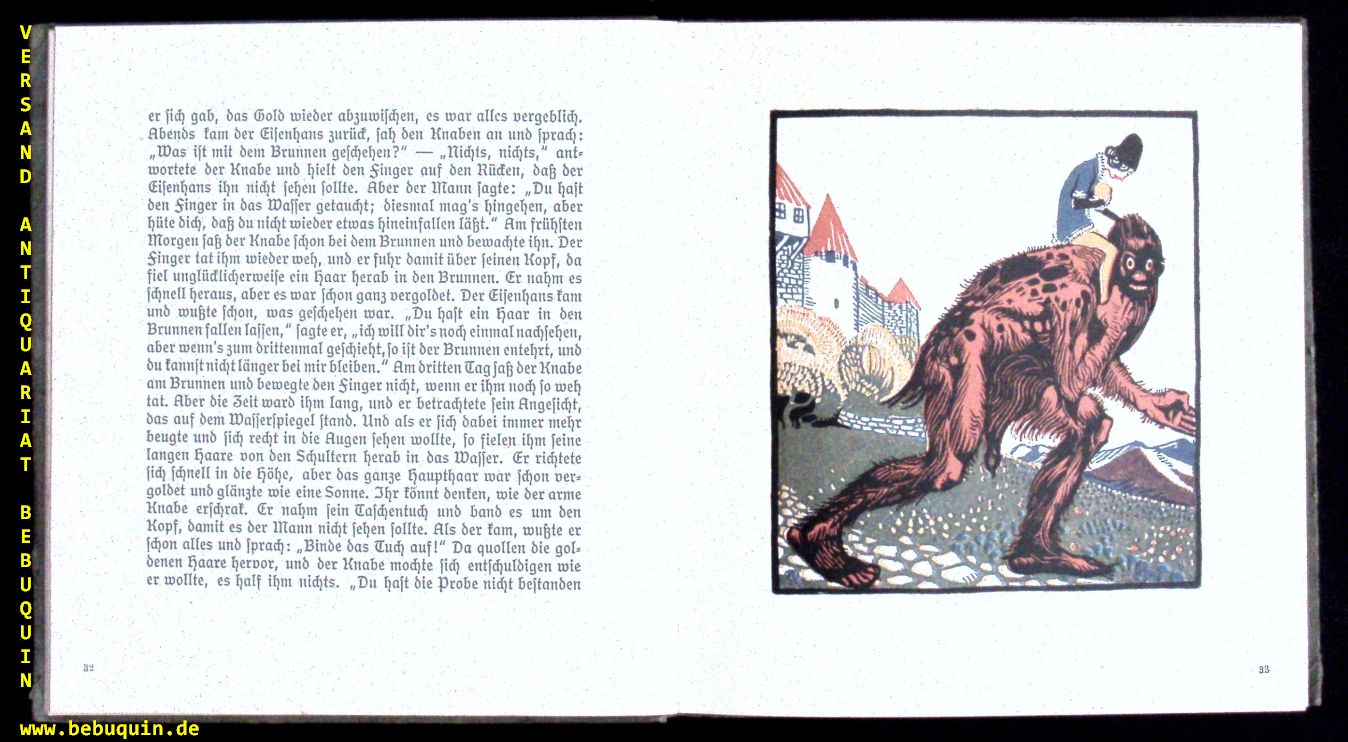 GERLACH`S JUGENDBÜCHEREI.– GRIMM, Brüder: Kinder- und Hausmärchen I. Wien, Leipzig (Gerlach & Wiedling), ca 1908. kl. 8°. 98 S. mit zumeist farb. Bildern von Ign. Taschner. ill. OHLn. leicht angeschmutzt und berieben. = Bd. 1. Nach Heller 156 die Titelauflaged er EA mit Nauskäfervorsätzen.