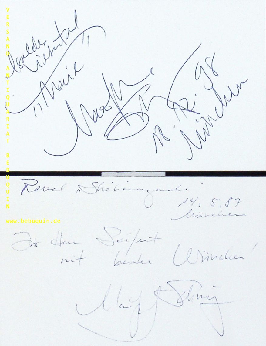 SCHMIEGE, Marilyn (Mezzosopranistin): 2 eigenhändig signierte und datierte Autogrammkarten. München, 1987 + 1998. 8 x 12,5 cm. 2 Karteikarten. Marilyn Schmiege (* 29. November 1948 in Milwaukee) ist eine amerikanisch-deutsche Sängerin in der Stimmlage Mezzosopran, Hochschullehrerin und Gesangspädagogin. (Wikipedia)