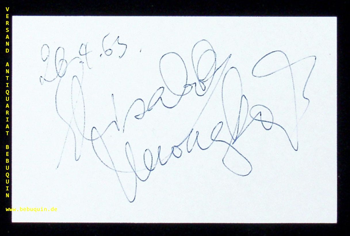 SCHWARZKOPF, Elisabeth (Sopran): eigenhändig signierte und datierte Autogrammkarte. München (Herkulessaal), 26.4.1963. 8 x 12,5 Karteikarte. Rückseite mit X. Dame Olga Maria Elisabeth Frederike Legge-Schwarzkopf (* 9. Dezember 1915 in Jarotschin, Provinz Posen; † 3. August 2006 in Schruns, Österreich) war eine deutsch-britische Opern- und Liedsängerin. Sie galt als eine der führenden Sopranistinnen der zweiten Hälfte des 20. Jahrhunderts, die besonders für ihre Interpretationen von Mozart- und Strauss-Opern bekannt war. Nicht wenige bedeutende Kritiker, Dirigenten und Kollegen hielten und halten Elisabeth Schwarzkopf – neben Maria Callas – sogar für die bedeutendste Vertreterin ihres Fachs im 20. Jahrhundert. (Wikipedia)