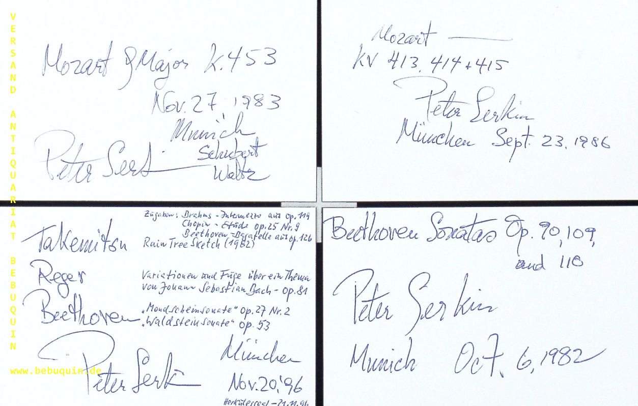 SERKIN, Peter (Pianist): 5 eigenhändig signierte und datierte Autogrammkarten mit teils ausführlichen eigenhändigen Programmbeschreibungen. München, 1980 – 1996. 18 x 12 cm. 5 Karteikarten. Peter Adolf Serkin (* 24. Juli 1947 in Manhattan, New York City, New York; † 1. Februar 2020 in Red Hook, New York) war ein US-amerikanischer Pianist europäischer Abstammung. Er war der Sohn des Pianisten Rudolf Serkin und Enkel des Violinisten Adolf Busch. (Wikipedia)