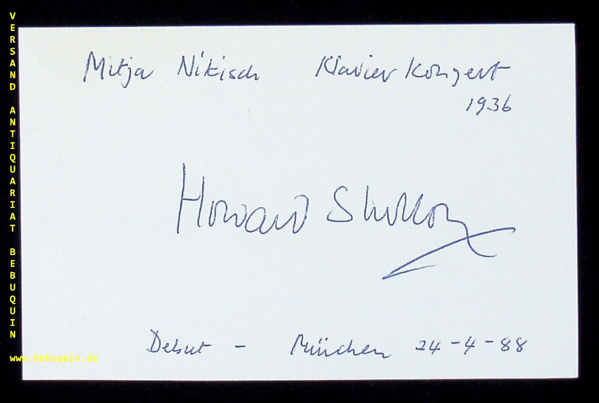 SHELLES, Howard (Pianist): eigenhändig signierte und datierte Autogrammkarte. Münchener Debut. München (Philharmonie), 24.4.1988. 8 x 12,5 cm. Karteikarte. Howard Gordon Shelley (born 9 March 1950) is a British pianist and conductor. He was educated at Highgate School and the Royal College of Music. He is married to fellow pianist Hilary Macnamara, with whom he has performed and recorded in a two-piano partnership, and they have two sons. (Wikepidia)