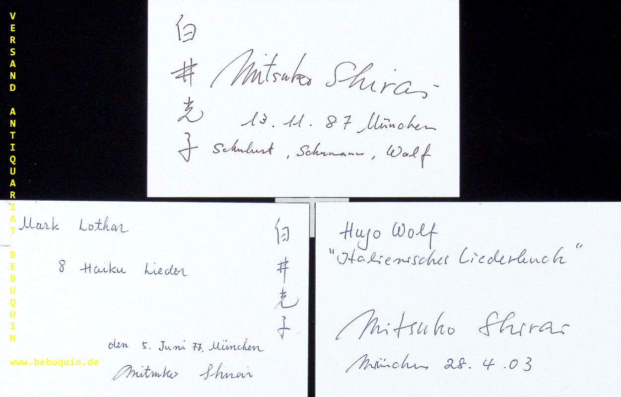 SHIRAI, Mitsuko (Sopran): 3 eigenhändig teils zweisprachig signierte und datierte Autogrammkarten. München (Philharmonie), 1977 – 2003. 8 x 12,5 cm. 3 Karteikarten. Mitsuko Shirai hat ihre japanische Heimat vor gut vierzig Jahren verlassen und als deutsche Liedsängerin im Duo mit Hartmut Höll Maßstäbe gesetzt. Seit 1973 Liederabende in Europa, Skandinavien, Israel, Afrika, Japan, Südamerika, Russland, den USA und Canada.