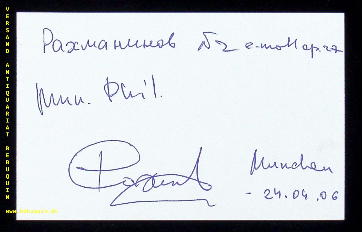 SOKHIEV, Tugan (Dirigent): eigenhändig signierte (wohl kyrillisch) und datierte Autogrammkarte. München (Philharmonie), 24.4.2006. 8 x 12,5 cm. Karteikarte. Tugan Taimurasowitsch Sochijew (* 22. Oktober 1977 in Ordschonikidse, Nordossetien) ist ein russischer Dirigent. Seit Januar 2014 ist er Musikdirektor des Bolschoi-Theaters und Chefdirigent des dort ansässigen Orchesters. Auch mit dem Mariinski-Theater in St. Petersburg und dem Londoner Philharmonia Orchestra verbindet Sochijew eine regelmäßige Zusammenarbeit. Darüber hinaus ist er ein weltweit gefragter Gastdirigent führender Opernhäuser und Orchester. Seine Debüts am Pult der Wiener Philharmoniker und Berliner Philharmoniker 2009 und 2010 führten unmittelbar zu Wiedereinladungen. 2013 debütierte er mit großem Erfolg beim Chicago Symphony Orchestra und beim Gewandhausorchester Leipzig. (Wikipedia)