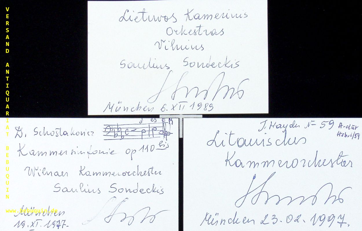 SONDECKIS, Saulius (Dirigent) 3 eigenhändig signierte und datierte Autogrammkarten. München, 1977 – 1997. 8 x 12,5 cm. 3 Karteikarten. . Saulius Sondeckis (* 11. Oktober 1928 in Šiauliai; † 3. Februar 2016) war ein litauischer Dirigent und Professor. (Wikipedia)