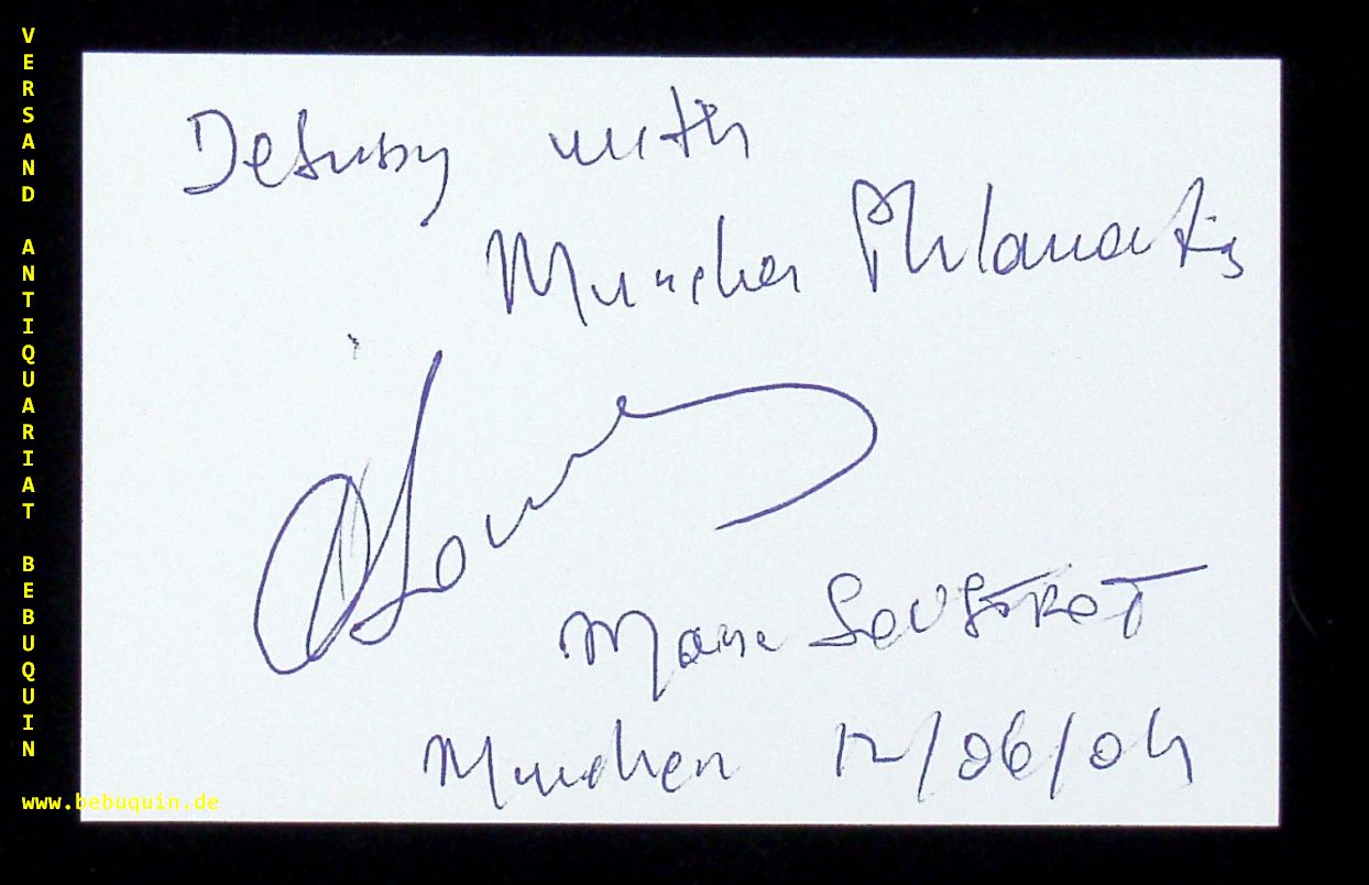 SOUSTROT, Marc (Dirigent): eigenhändig signierte und datierte Autogrammkarte. München (Philharmonie), 12.6.2004. 8 x 12,5 cm. Karteikarten. Marc Soustrot (born 15 April 1949) is a French classical conductor. He was the music director of the Orchestre national des Pays de la Loire from 1976 to 1994, and from 1995 to 2003 GMD of the Beethoven Orchester Bonn which plays in both opera and concert. (Wikipedia)