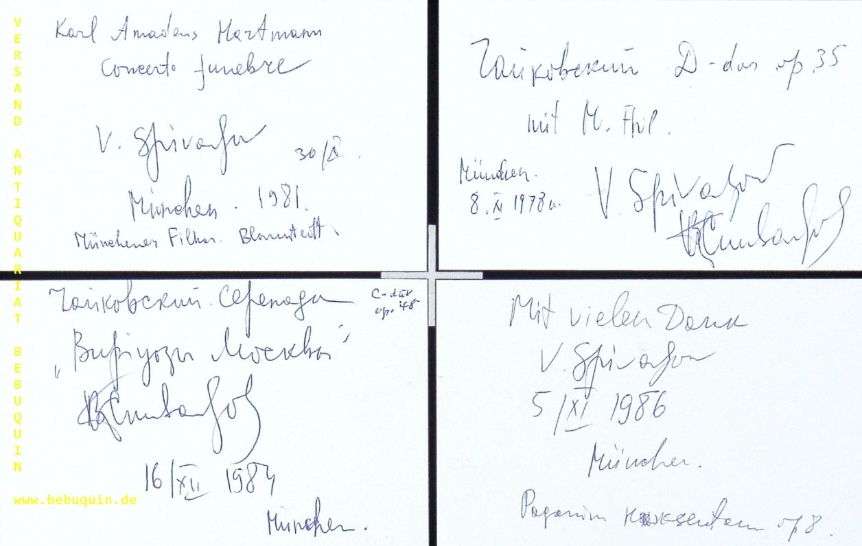 SPIWAKOW, Vladimir (Violinist): 11 eigenhändig signierte und datierte Autogrammkarten. München (Philharmonie), 1978 – 2002. 8 x 12,5 cm. 11 Karteikarte. Wladimir Teodorowitsch Spiwakow (* 12. September 1944 in Ufa, Sowjetunion) ist ein russischer Geiger und Dirigent. Seit 1989 leitet er das Internationale Musikfestival von Colmar. Er ist zudem musikalischer Direktor und Chefdirigent der 2003 gegründeten Russischen Nationalphilharmonie sowie Präsident des Moskauer Internationalen Hauses der Musik. (Wikipedia)