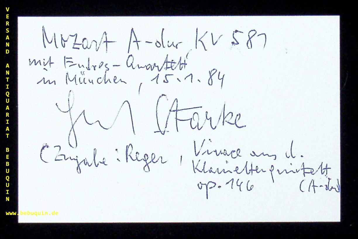 STARKE, Gerd (Klarinettist): eigenhändig signierte und datierte Autogrammkarte mit umfangreicher eigenhändiger Programmbeschreibung. München (Herkulessaal), 15.1.1984. 8 x 12,5 cm Karteikarte. 1930 in Graslitz/Sudetenland geboren, studierte Gerhard Starke von 1945 bis 1950 in Dresden bei Karl Schütte und von 1950 bis 1951 in Berlin bei Albert Heinke Klarinette. Seine erste Anstellung als Soloklarinettist führte ihn an die Landesoper Sachsen in Radebeul, von wo aus er 1952 an die Sächsische Staatskapelle nach Dresden wechselte. Neben seiner solistischen Tätigkeit war Gerhard Starke unter anderem Lehrbeauftragter am Konservatorium Dresden und München. Zeitweise war er als Orchestervorstand in Dresden und München tätig und bekleidete sechs Jahre lang das Amt des Vizepräsidenten an der Musikhochschule München. Als Juror begleitet er zahlreiche internationale Wettbewerbe. (Wikipedia)