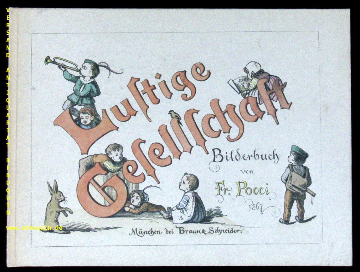 POCCI, Franz: Lustige Gesellschaft. Bilderbuch. Neudruck der 1867 ersch. Ausgabe. Würzburg (Popp), 1979. Quer 4°. 59, 5 S. mit überwiegend farb. Bildern. farb. ill. OPb. gutes Ex.