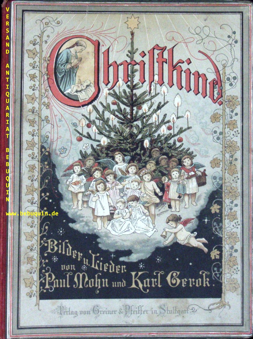 GEROK, Karl: Christkind. Bilder und Lieder. Stuttgart (Greiner & Pfeiffer), 1904. 4“. 27 Bl. mit 14 Chromolithographien von Paul Mohn sowie 13 Bl. Text. farb . ill. OHLn. NaV, einige tafeln mit kleinen Hinterlegungen und Flecken, eine Tafel neu aufgezogen, insgesamt noch gut erhalten. „Die verniedlichenden Bilder zur Kindheitsgeschichte Jesu verbergen sich hinter einem Weihnachtsbaumeinband.“ Schug 1150; Klotz 1871 /1;