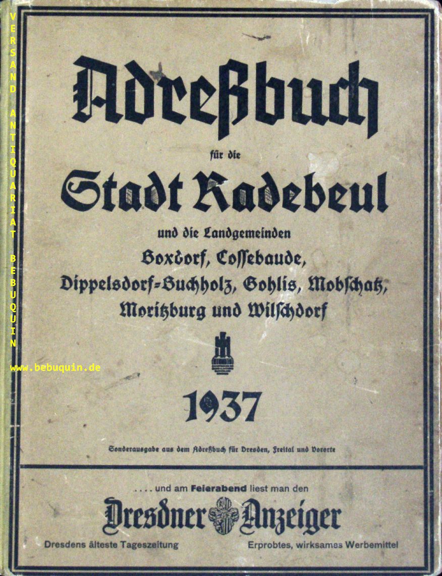 ADRESSBUCH FÜR DIE STADT RADEBEUL 1937.– Mit den Stadtteilen Kötzschenbroda mit…