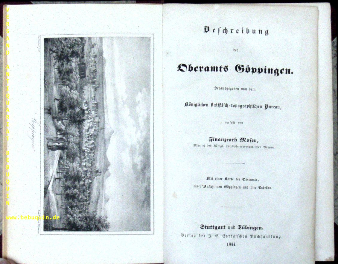 GÖPPINGEN.– MOSER, Rudolf: Beschreibung des Oberamts Göppingen. Hrsg. von dem Königlichen statistiosch-topographischen Bureau. Stuttgart (Cotta), 1844. IV, 302 S., 1 Bl. mit einer mehrfach gefalteten Karte des Oberamts, einer Ansicht von Göppingen und vier Tabellen. neues HLn. Ansicht beschnitten und aufgezogen, vereinzelte Stockflecken. EA.