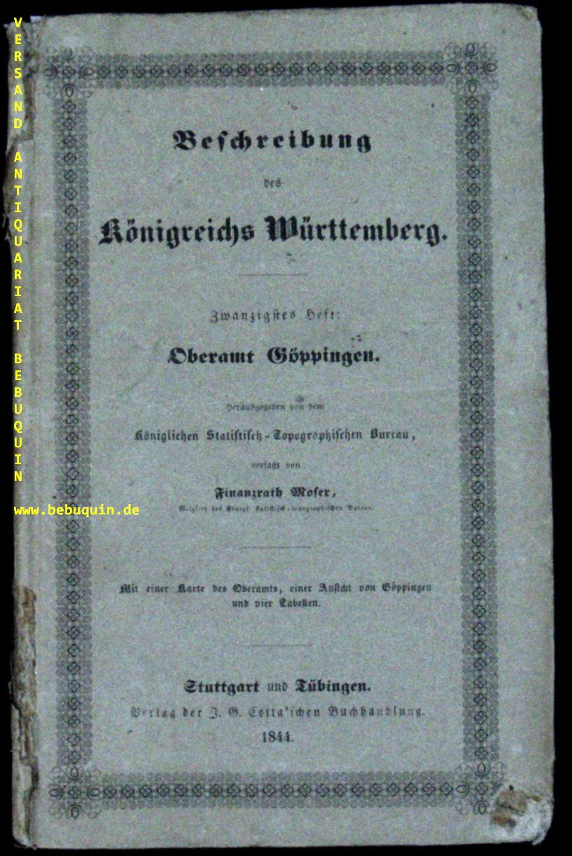 GÖPPINGEN.– MOSER, Rudolf: Beschreibung des Oberamts Göppingen. Hrsg. von dem Königlichen statistiosch-topographischen Bureau. Stuttgart (Cotta), 1844. IV, 302 S., 1 Bl. mit einer Ansicht von Göppingen und vier Tabellen. OPb. Rücken lädiert, die fehlende Karte liegt in Kopie bei, vereinzelte Stockflecken. EA.