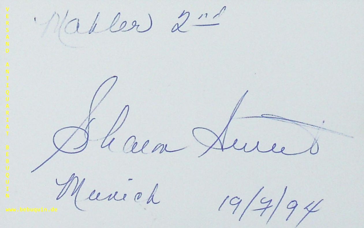 SWEET, Sharon (Sopran): eigenhändig signierte und datierte Autogrammkarte. München (Philharmonie), 19.7.1994.. 8 x 12,5 cm Karteikarte. Sharon Sweet (* 16. August 1951 in Gloversville) ist eine US-amerikanische Opernsängerin (Sopran). 1999 gab sie ihre Karriere auf, um fortan als Gesangslehrerin zu arbeiten. In einem Interview mit der Zeitschrift Opera News gab die korpulente Sängerin als Grund an, dass im heutigen Opernbetrieb das Aussehen wichtiger als die Stimme sei. Der Musikkritiker Manuel Brug wies jedoch darauf hin, dass seiner Meinung nach bei Sharon Sweet „einer herrlich tragfähigen Stimme mit berückendem Höhenglanz […] eine farblose Darstellerin“ gegenüber gestanden habe.(Wikipedia)