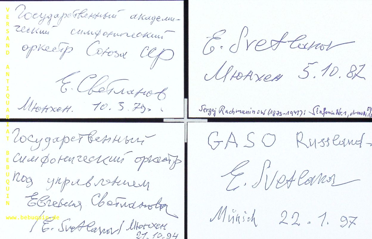 SVETLANOW, Jewgenij (Dirigent): 8 eigenhändig signierte und datierte Autogrammkarten mit zumeist längeren eigenhändigen Programmbeschreibungen. München (Herkulessaal), 1967 – 1997. 20 x 21 cm. 8 Karteikarten. Jewgeni Fjodorowitsch Swetlanow (* 6. September 1928 in Moskau; † 3. Mai 2002 ebenda) war ein russischer Dirigent, Komponist und Pianist. (Wikipedia)